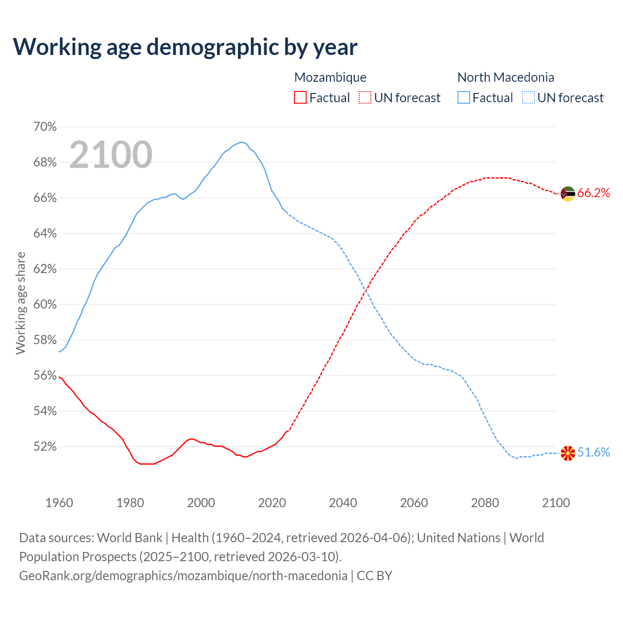 - Mozambique has 19.5M working age adults (aged 15-64) vs 1.18M in North Macedonia.