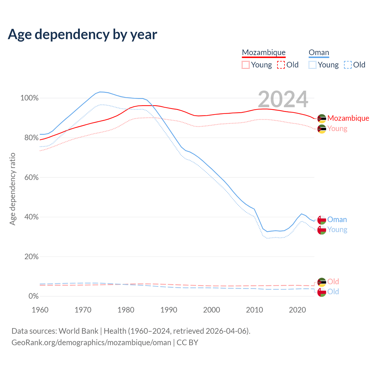 - Mozambique is ranked 189/196 by median age (oldest to youngest) vs 101/196 for Oman.