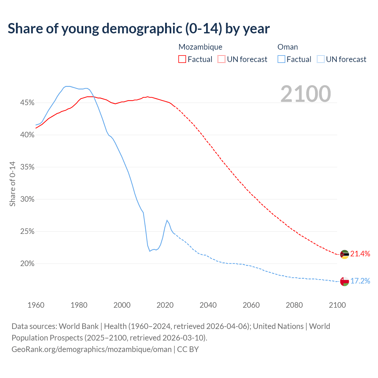 - The share of young demographic (0-15 years old) in Mozambique is 44.5% vs 24.7% in Oman.