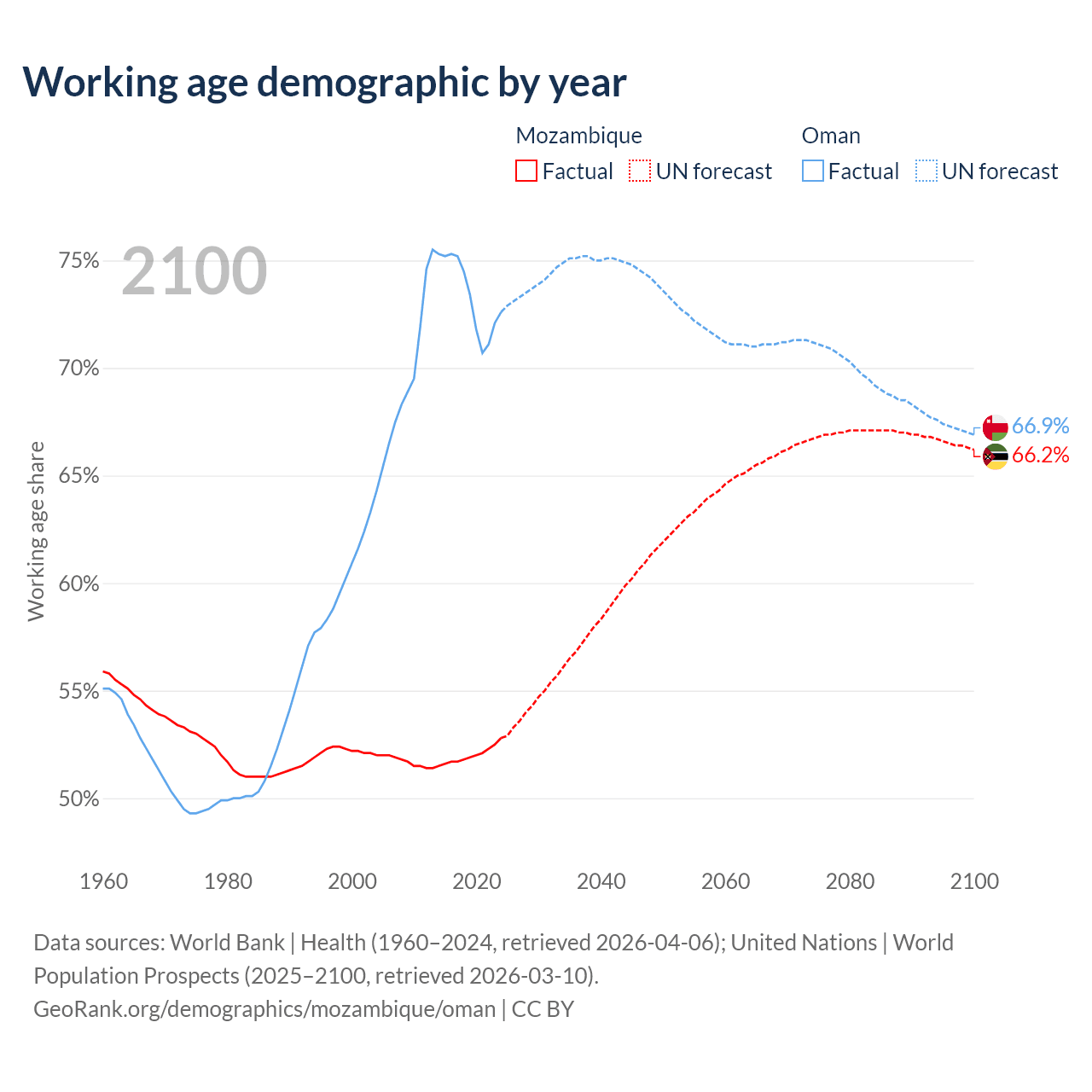 - Mozambique has 19.5M working age adults (aged 15-64) vs 4.19M in Oman.
