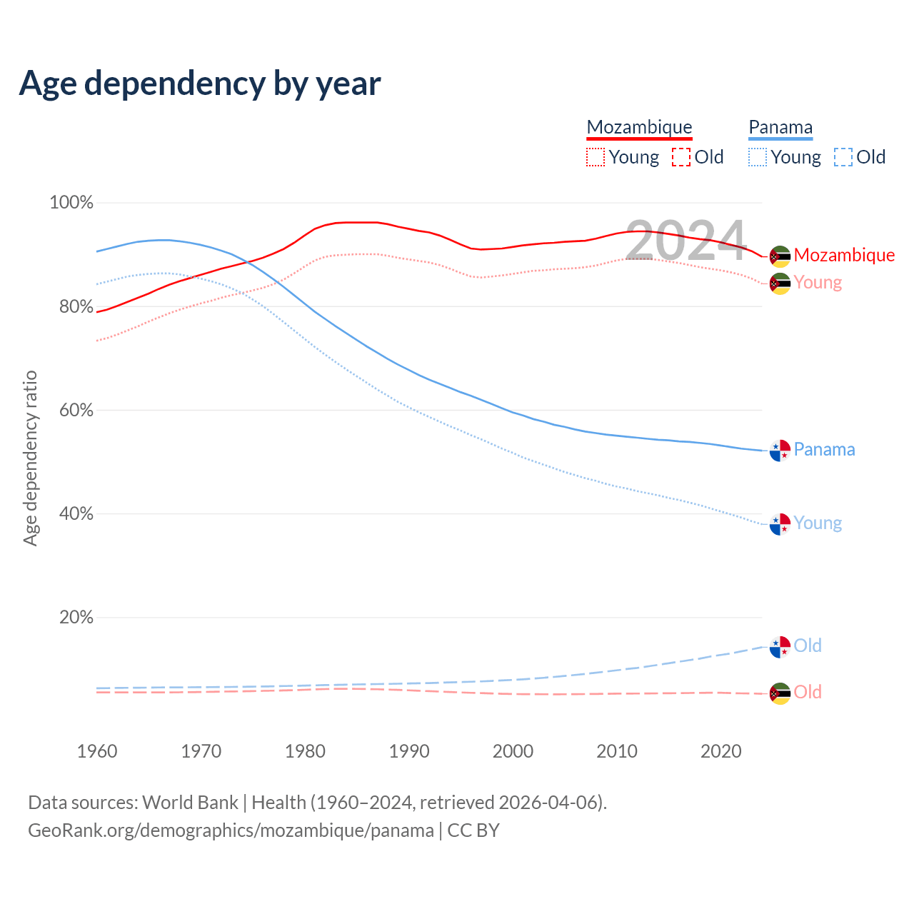 - Mozambique is ranked 189/196 by median age (oldest to youngest) vs 94/196 for Panama.