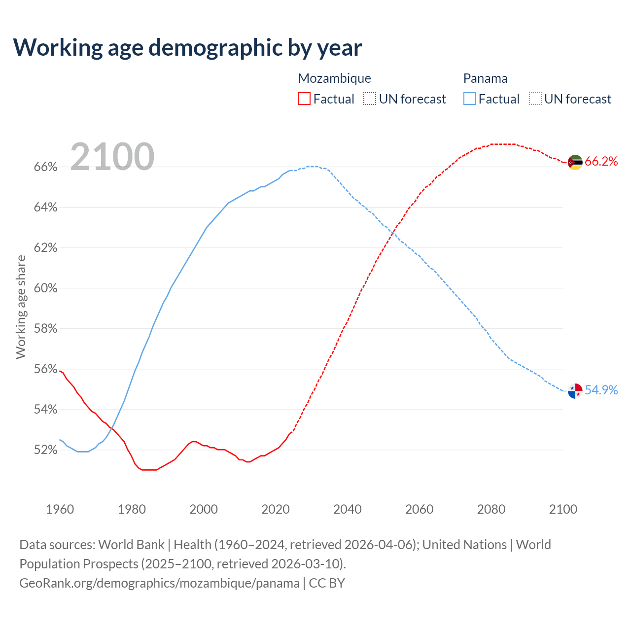 - Mozambique has 19.5M working age adults (aged 15-64) vs 3.05M in Panama.