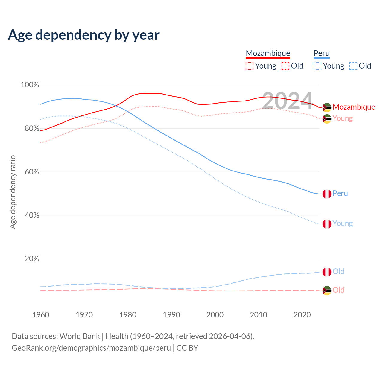 - Mozambique is ranked 189/196 by median age (oldest to youngest) vs 97/196 for Peru.