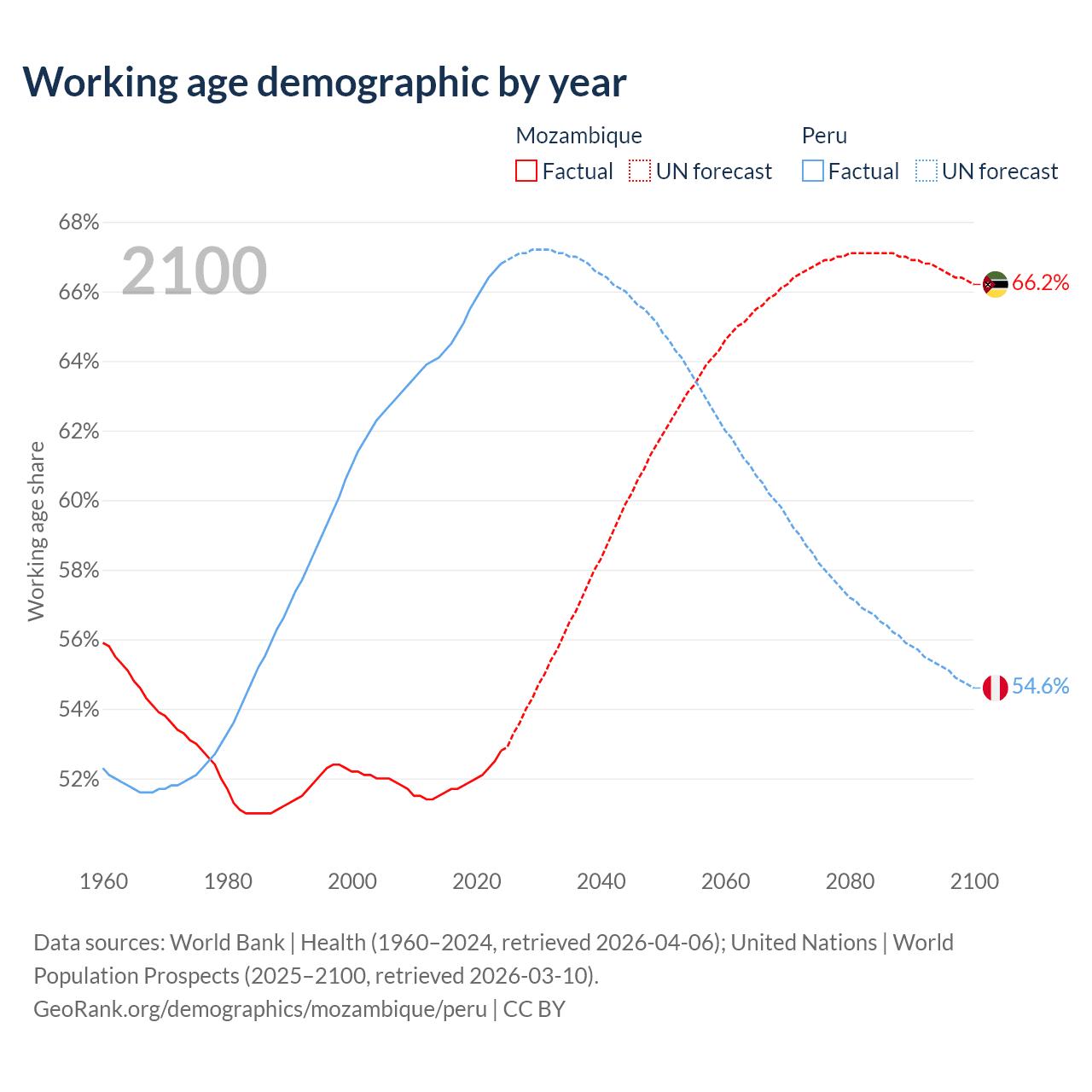 - Mozambique has 19.5M working age adults (aged 15-64) vs 23.4M in Peru.