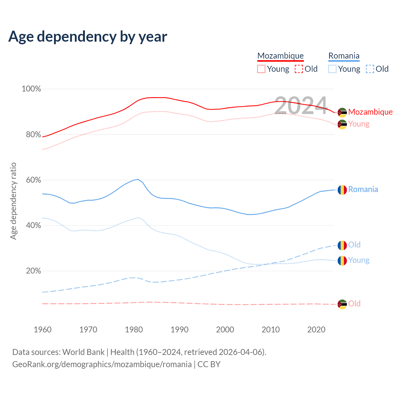 The share of older people aged 65 and over is 2.75% in Mozambique and 20% in Romania. Life expectancy in Mozambique compared to Romania .