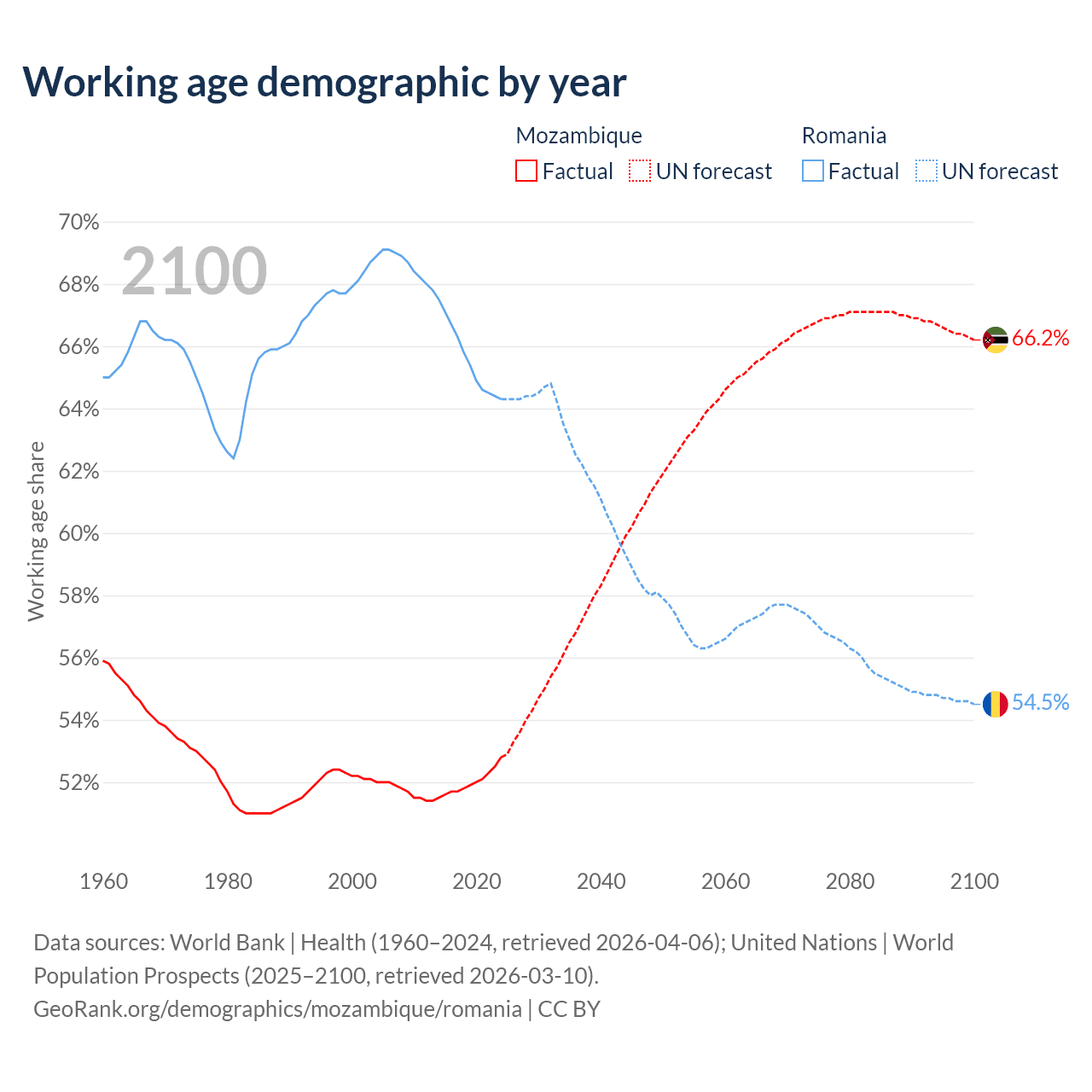 - Mozambique has 19.5M working age adults (aged 15-64) vs 12.1M in Romania.