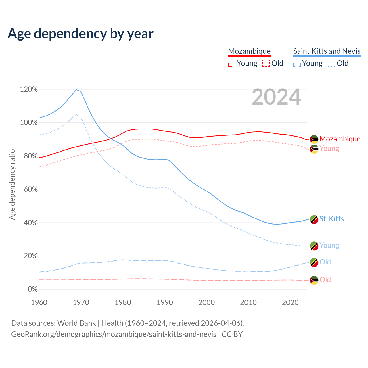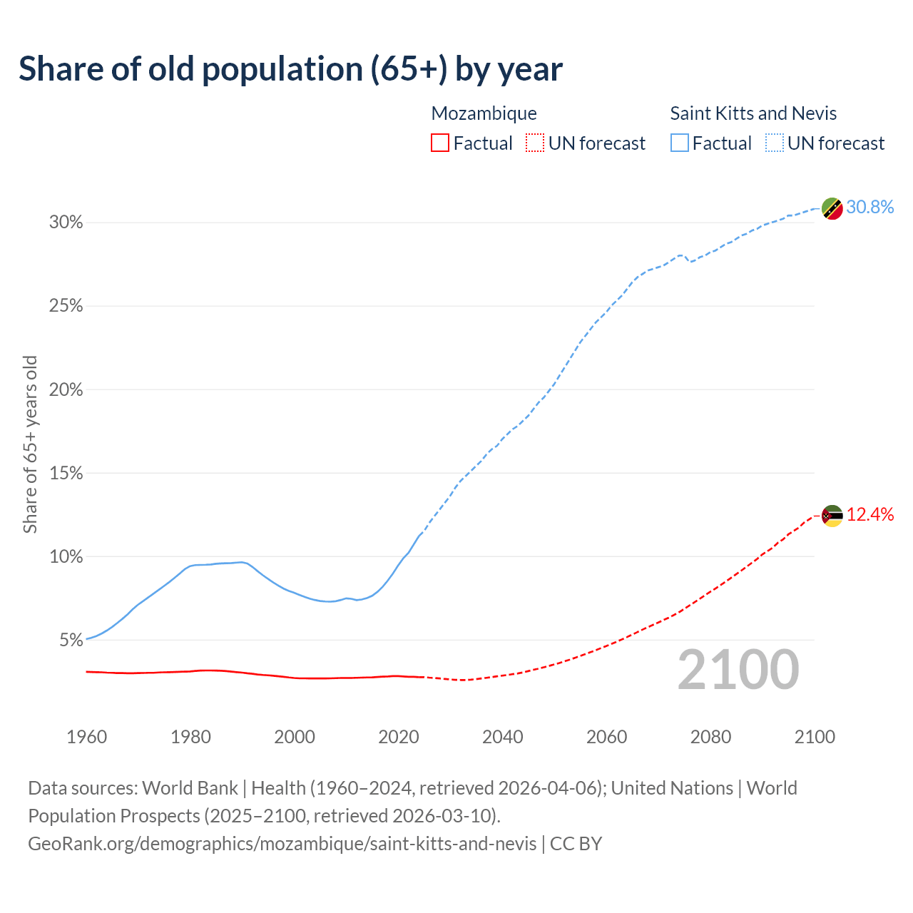 The share of older people aged 65 and over is 2.75% in Mozambique and 11.2% in Saint Kitts and Nevis. Life expectancy in Mozambique compared to Saint Kitts and Nevis .