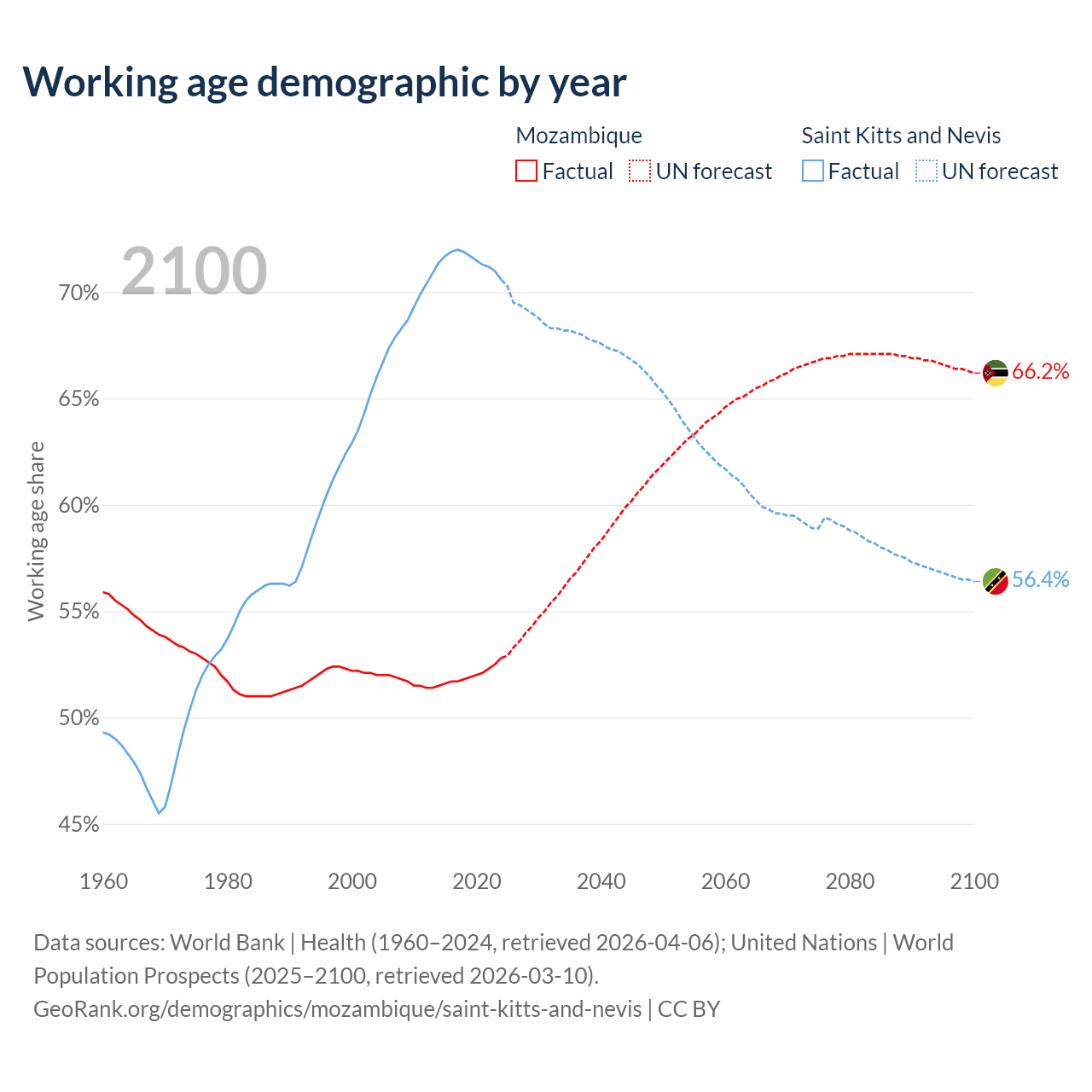 - The share of young demographic (0-15 years old) in Mozambique is 44.5% vs 18.2% in Saint Kitts and Nevis.