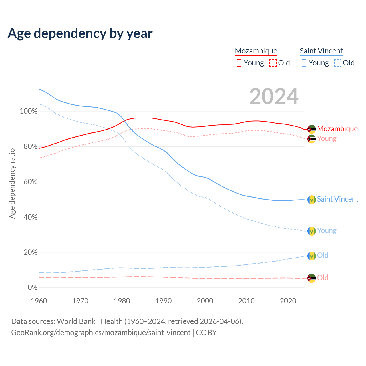 - The share of young demographic (0-15 years old) in Mozambique is 44.5% vs 21.3% in Saint Vincent.