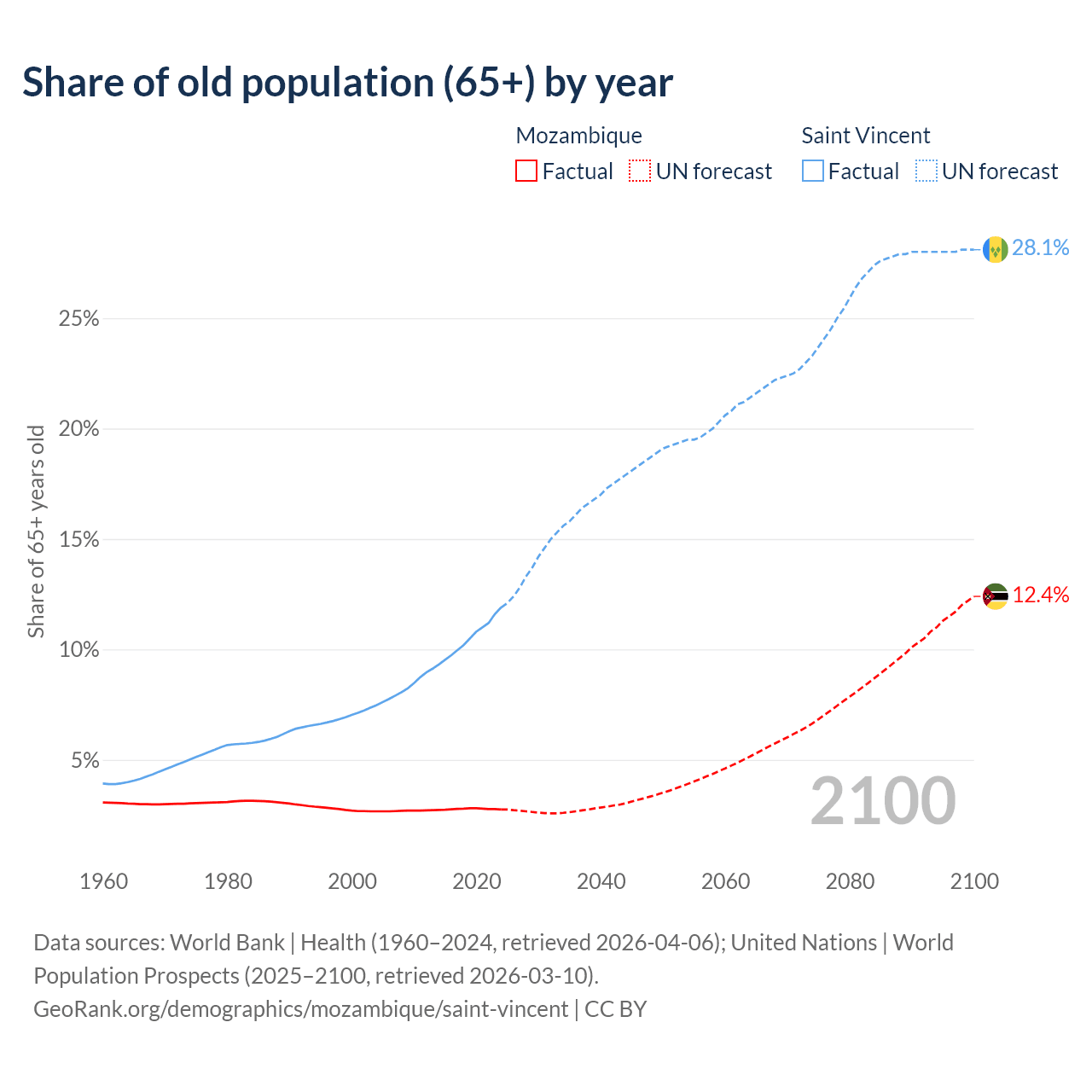 The share of older people aged 65 and over is 2.75% in Mozambique and 11.9% in Saint Vincent. Life expectancy in Mozambique compared to Saint Vincent .
