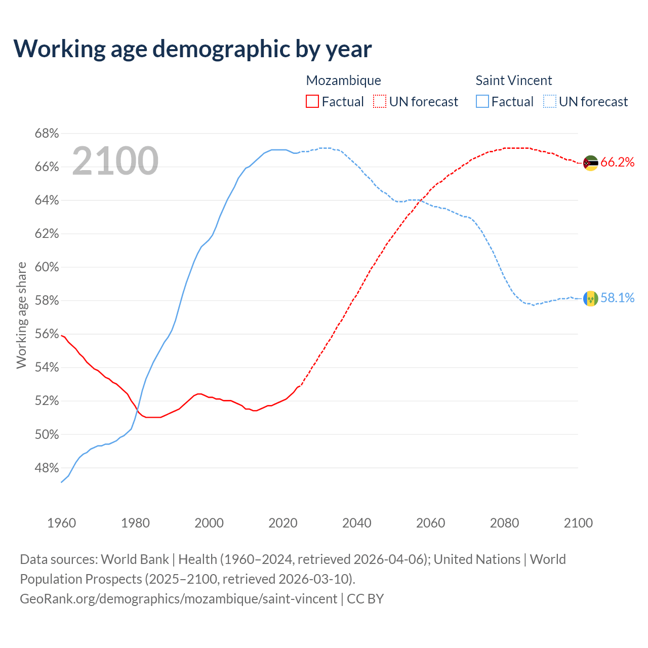 - Mozambique has 19.5M working age adults (aged 15-64) vs 66.3K in Saint Vincent.