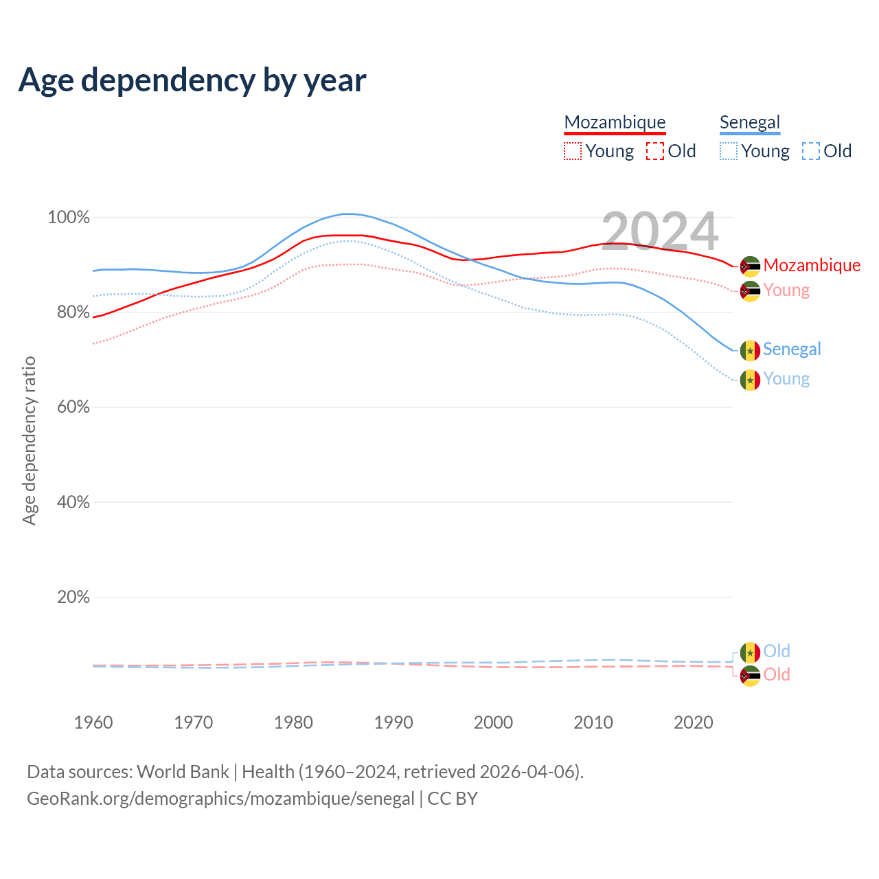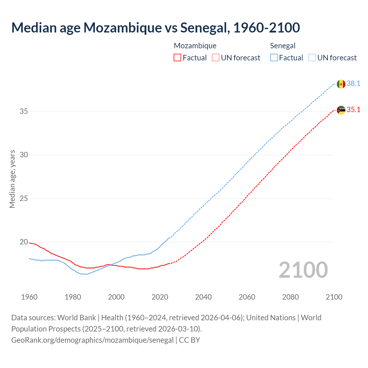 - Mozambique is ranked 189/196 by median age (oldest to youngest) vs 162/196 for Senegal.