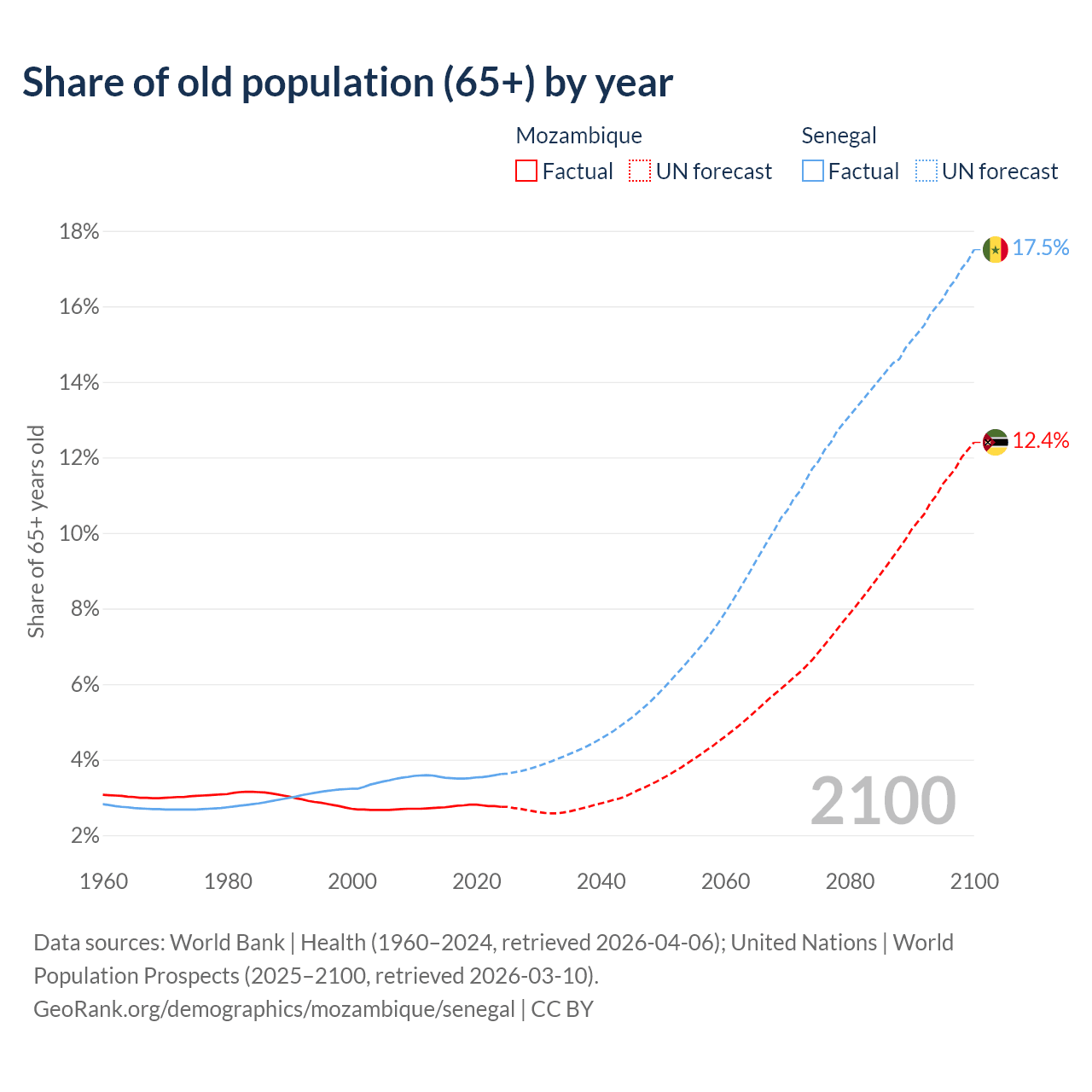 - The share of old-age demographic (65+) in Mozambique is 2.75% vs 3.62% in Senegal.