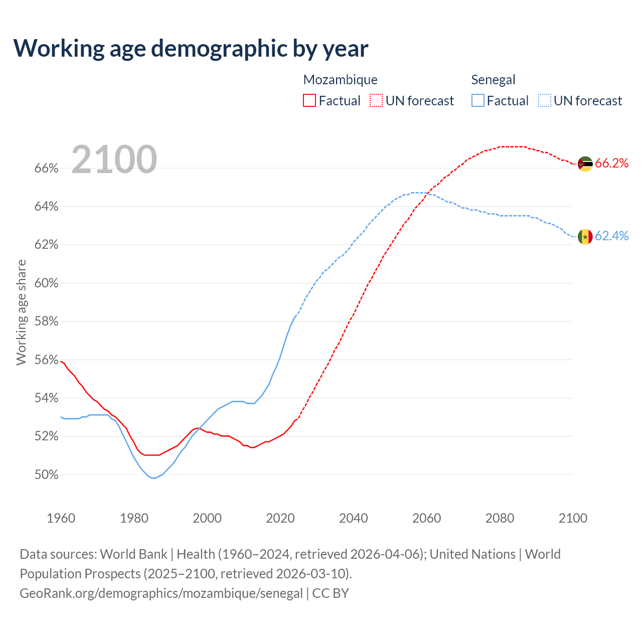- Mozambique has 19.5M working age adults (aged 15-64) vs 11.3M in Senegal.
