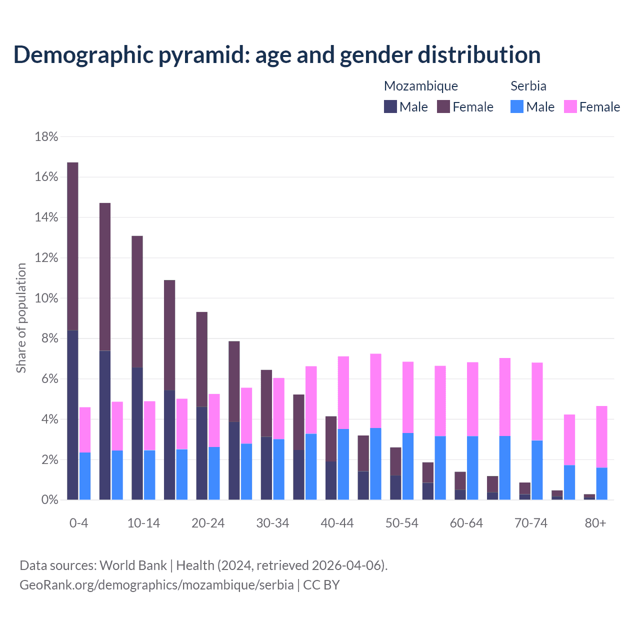 - Mozambique is ranked 189/196 by median age (oldest to youngest) vs 15/196 for Serbia.