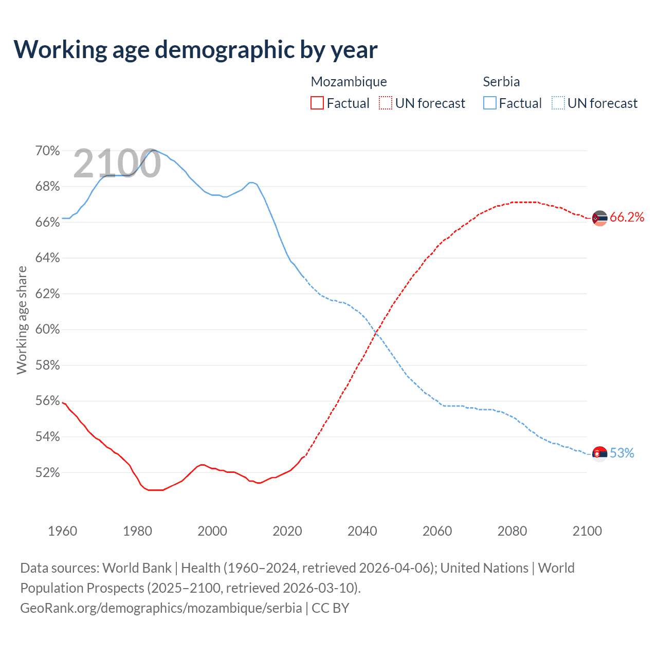 - Mozambique has 19.5M working age adults (aged 15-64) vs 4.09M in Serbia.
