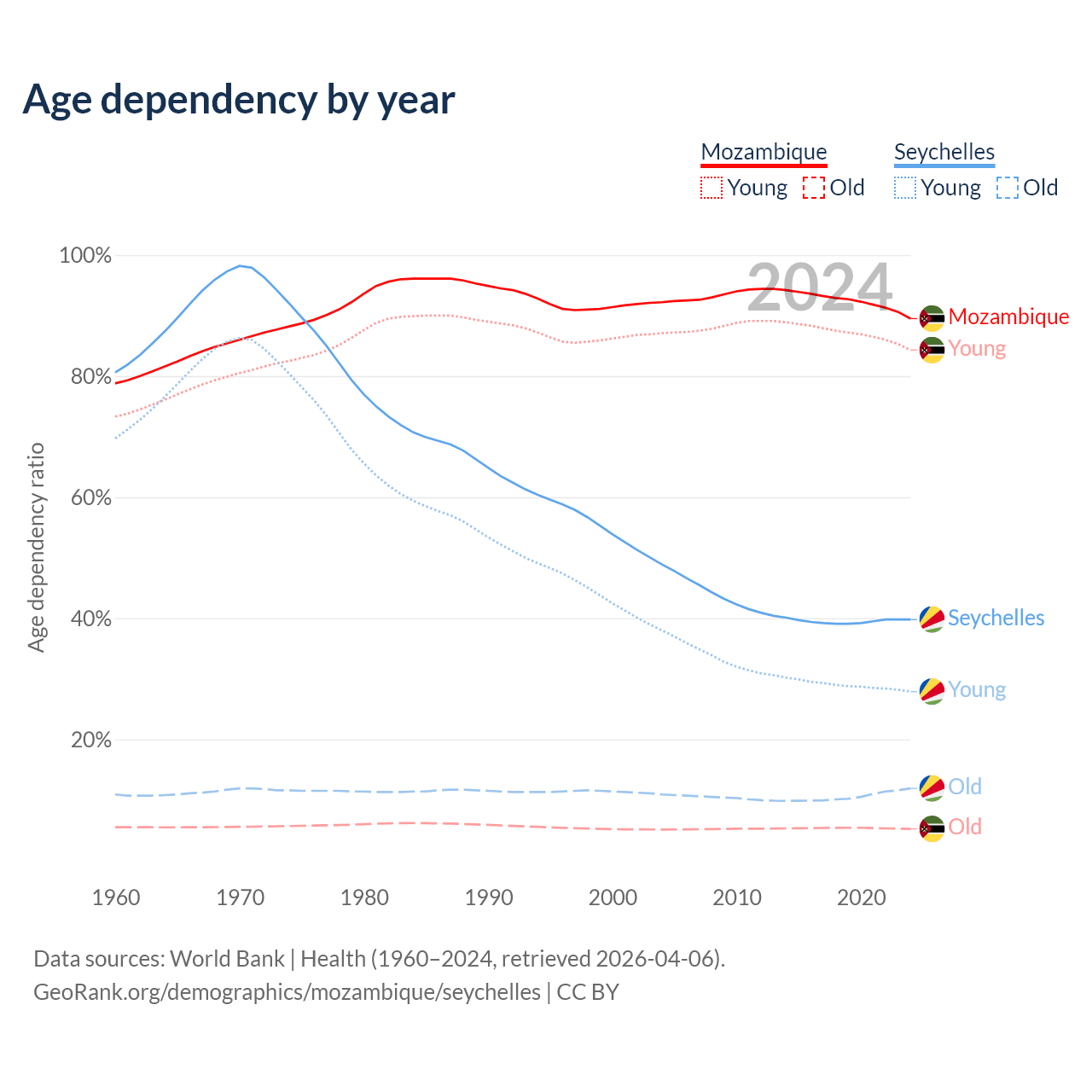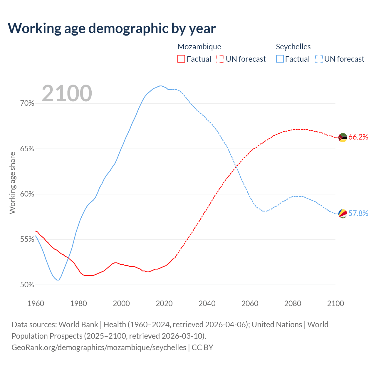 The share of older people aged 65 and over is 2.75% in Mozambique and 8.54% in the Seychelles. Life expectancy in Mozambique compared to the Seychelles .