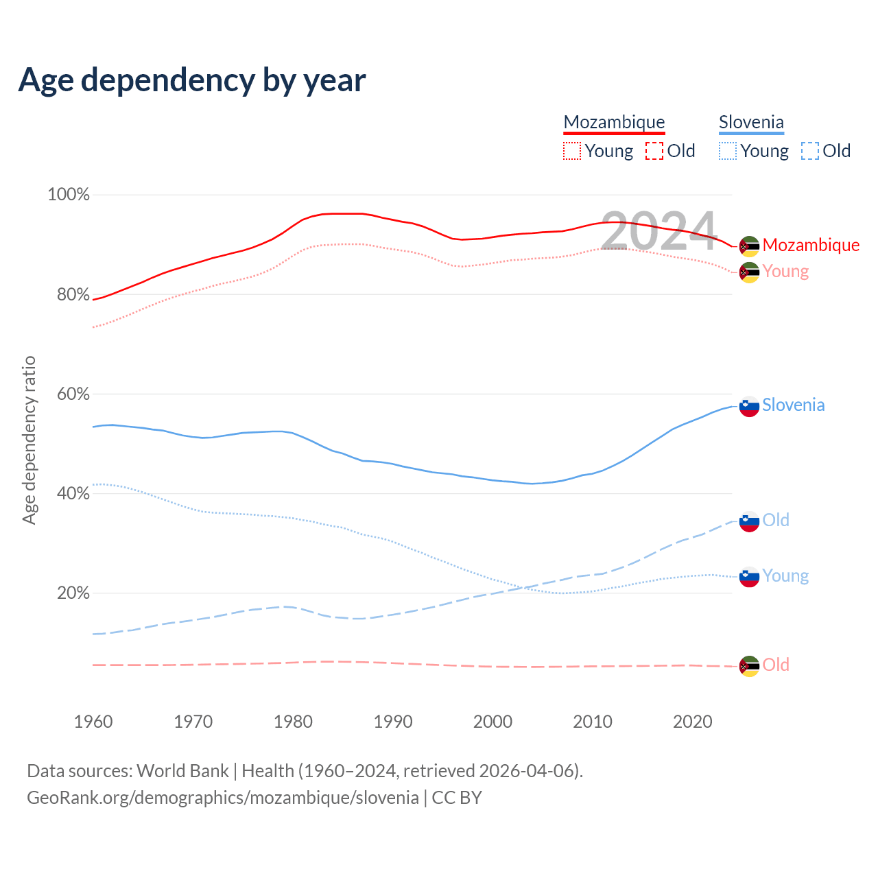 - Mozambique is ranked 189/196 by median age (oldest to youngest) vs 14/196 for Slovenia.