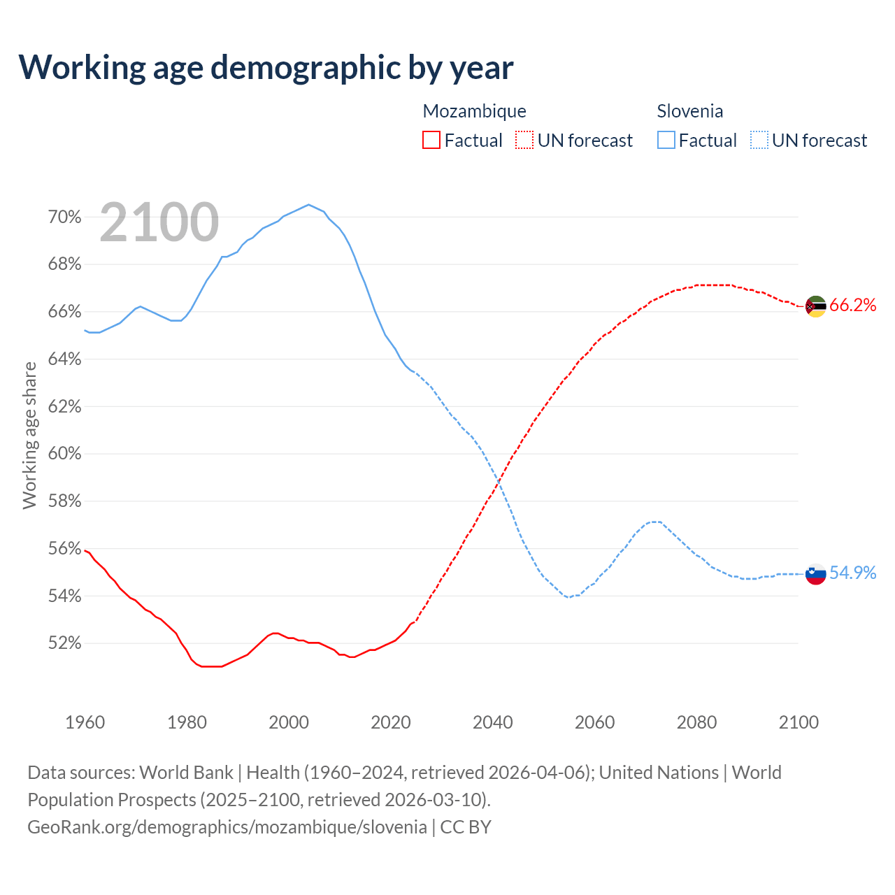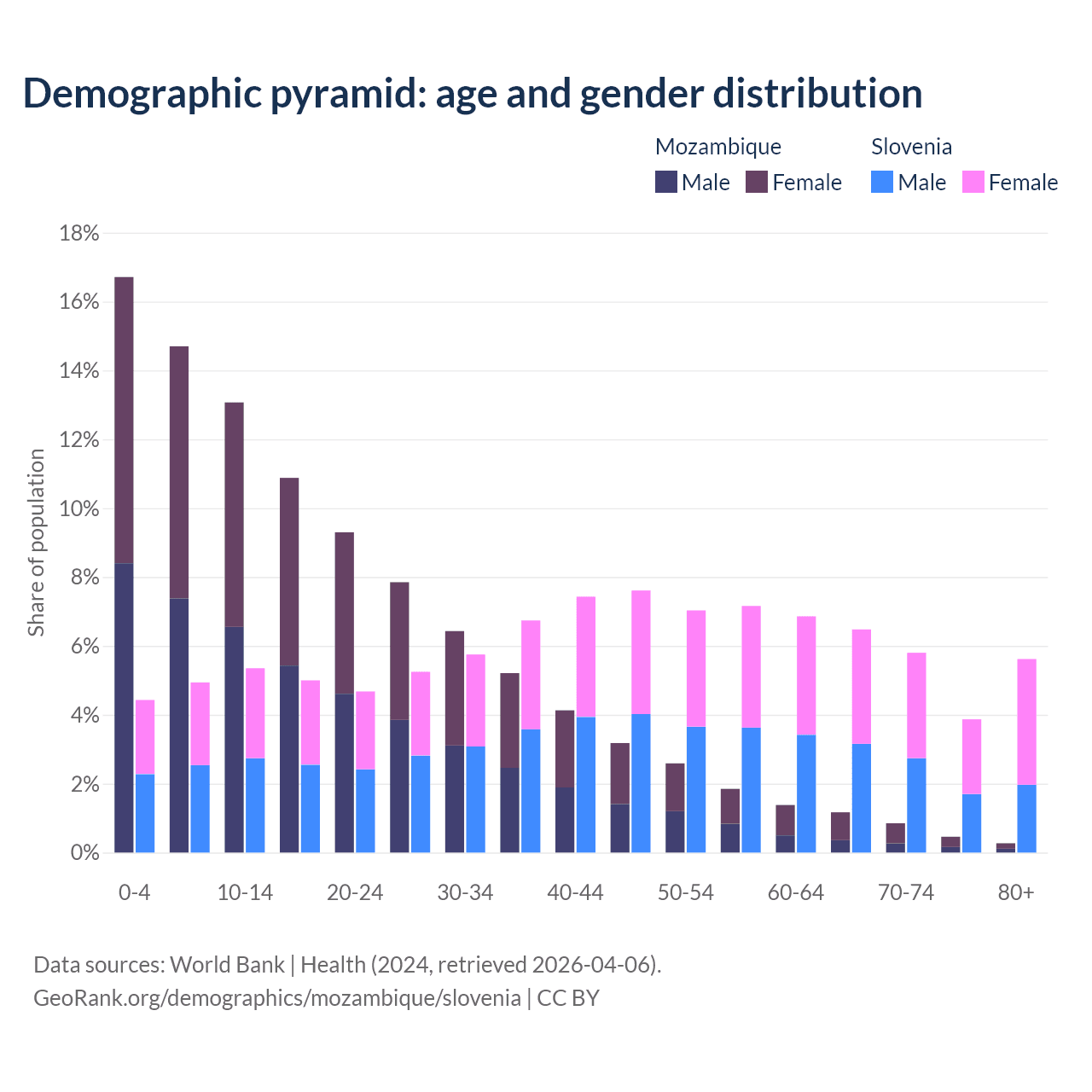 The share of older people aged 65 and over is 2.75% in Mozambique and 21.8% in Slovenia. Life expectancy in Mozambique compared to Slovenia .