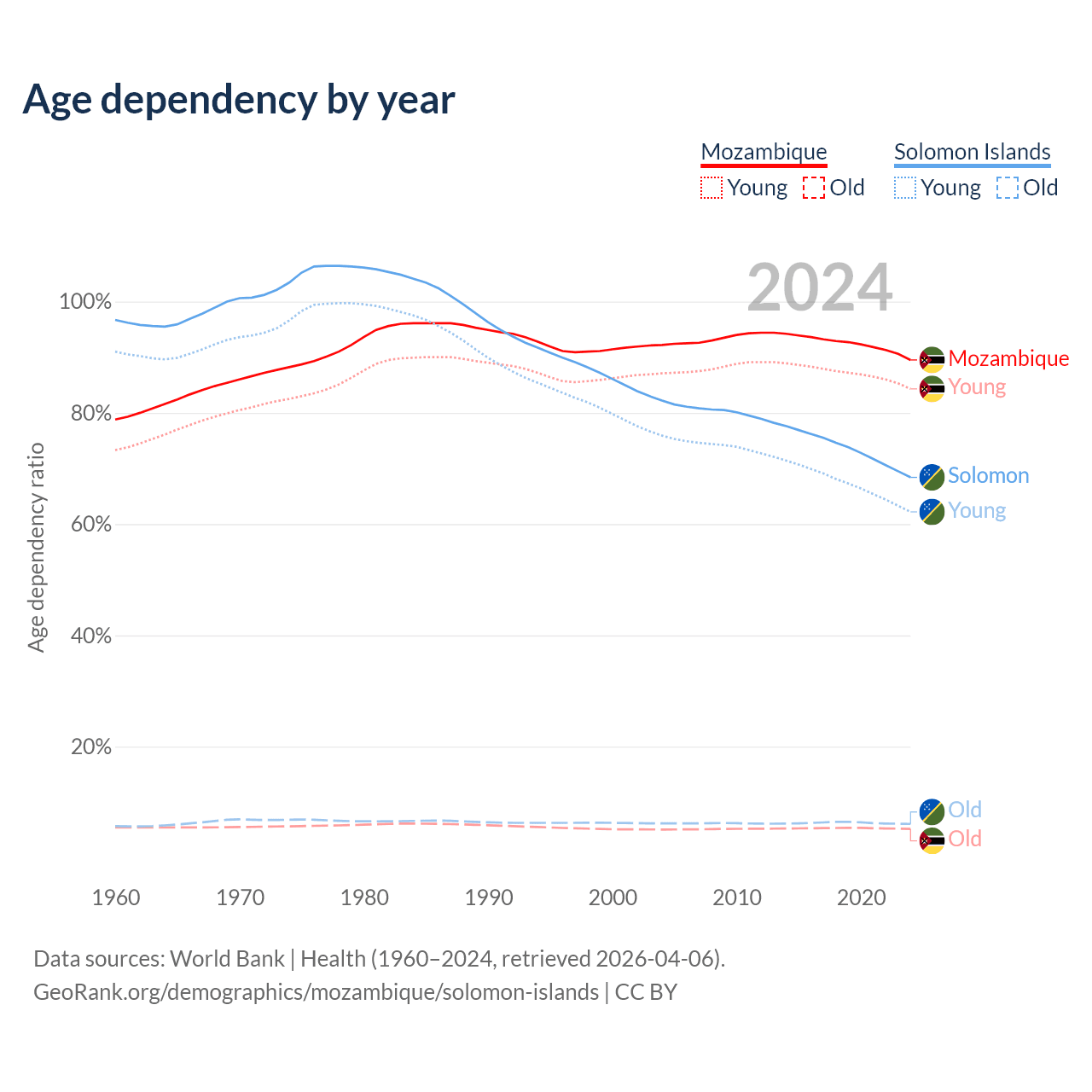 - Mozambique is ranked 189/196 by median age (oldest to youngest) vs 153/196 for the Solomon Islands.
