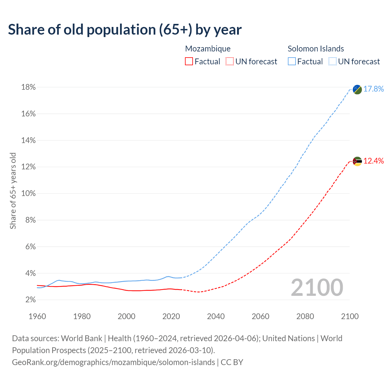 The share of older people aged 65 and over is 2.75% in Mozambique and 3.64% in the Solomon Islands. Life expectancy in Mozambique compared to the Solomon Islands .