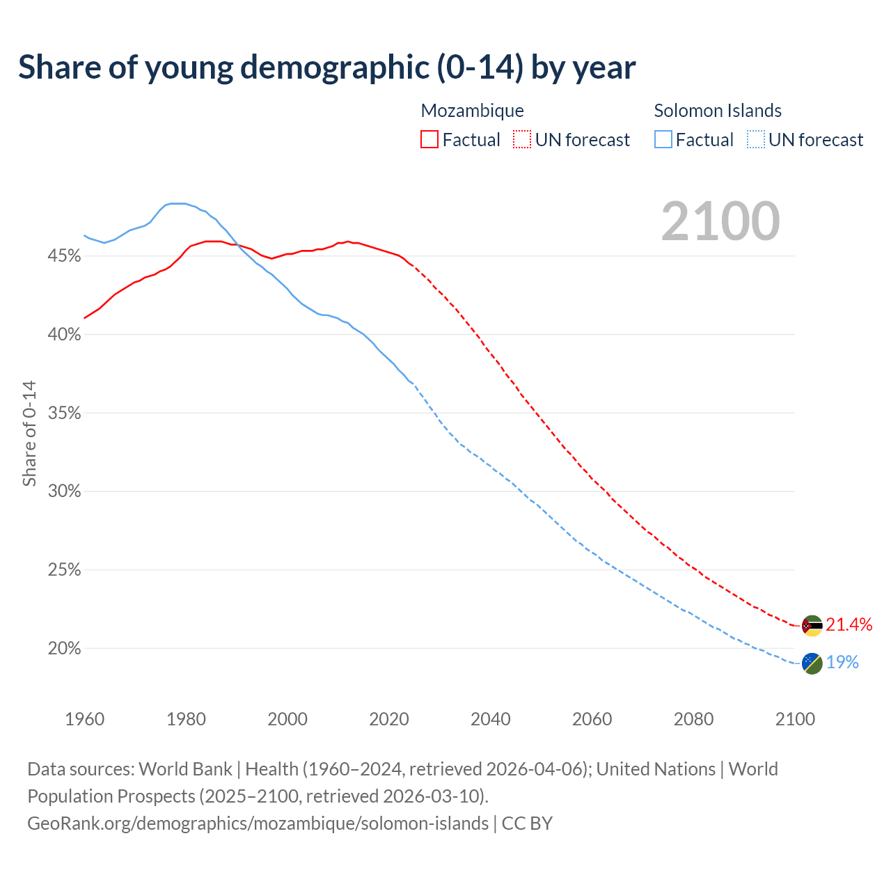 - The share of young demographic (0-15 years old) in Mozambique is 44.5% vs 37% in the Solomon Islands.