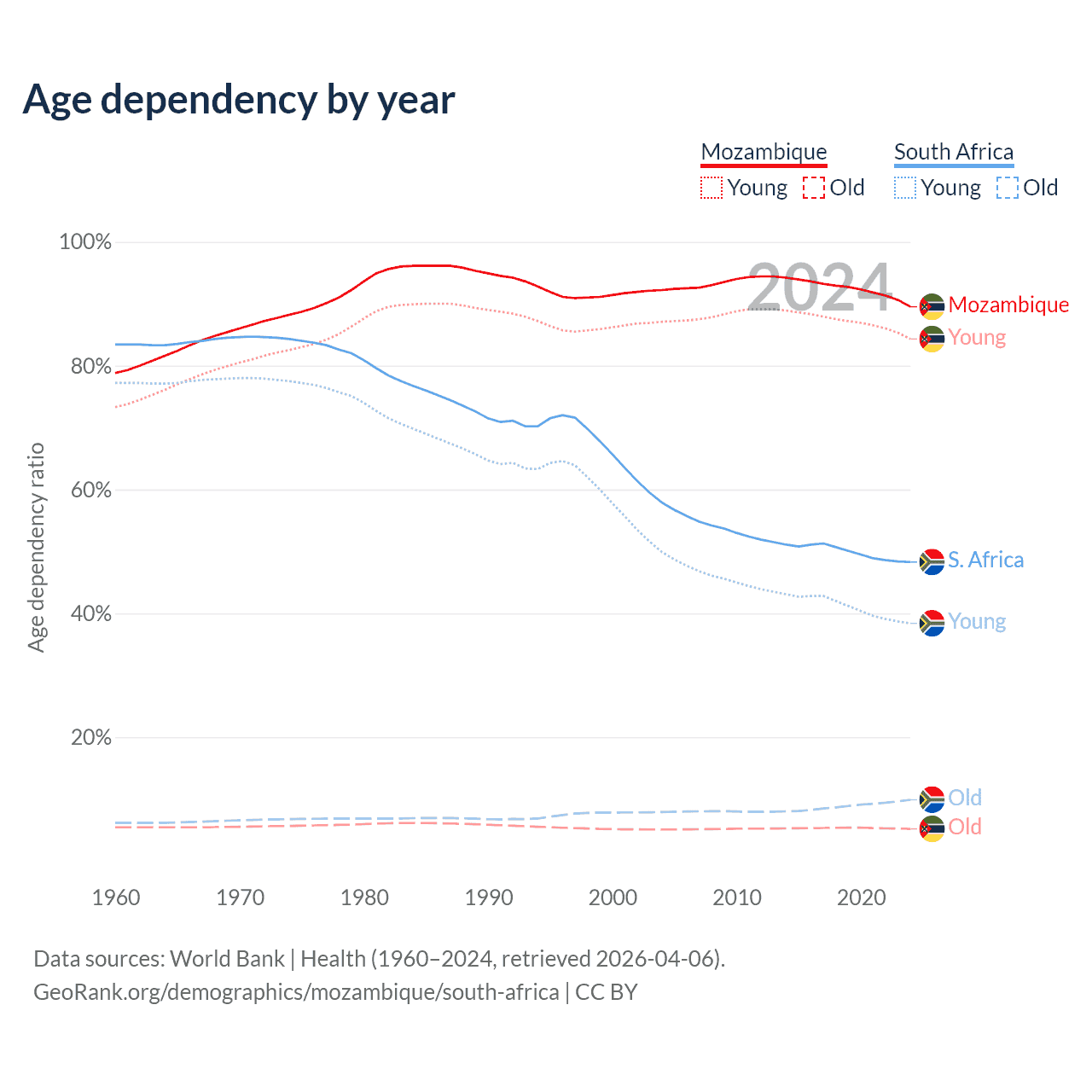 Data sources: World Bank | Health (1960–2024, retrieved 2026-04-06); U.S. Census Bureau (1960–2024, retrieved 2026-02-08).