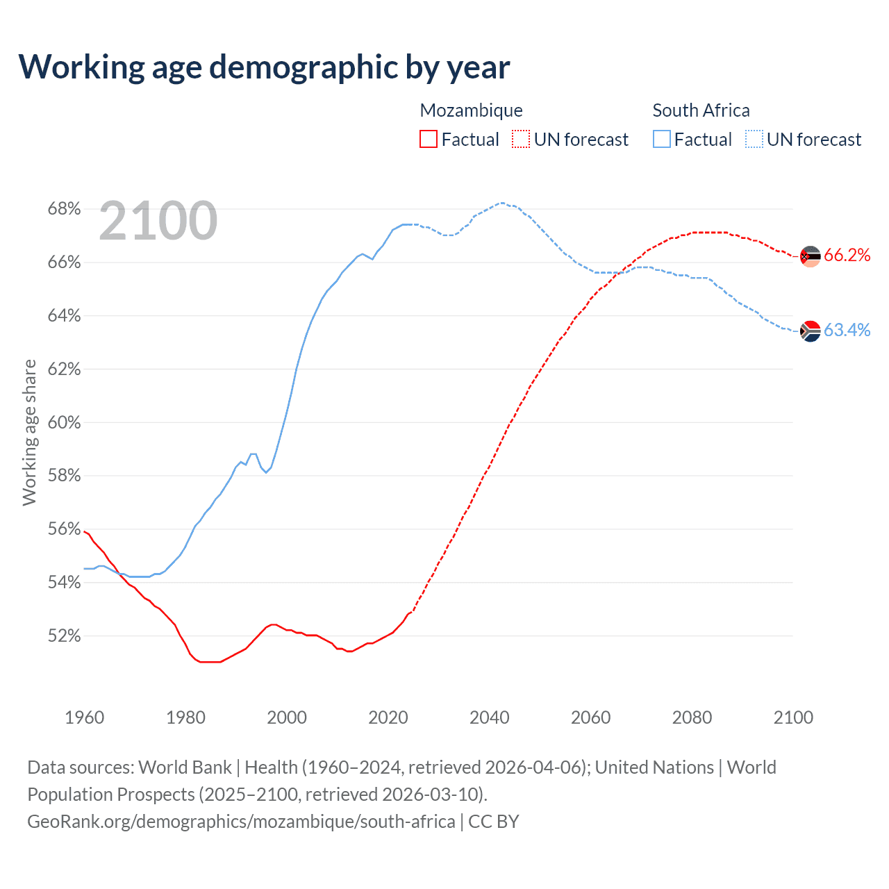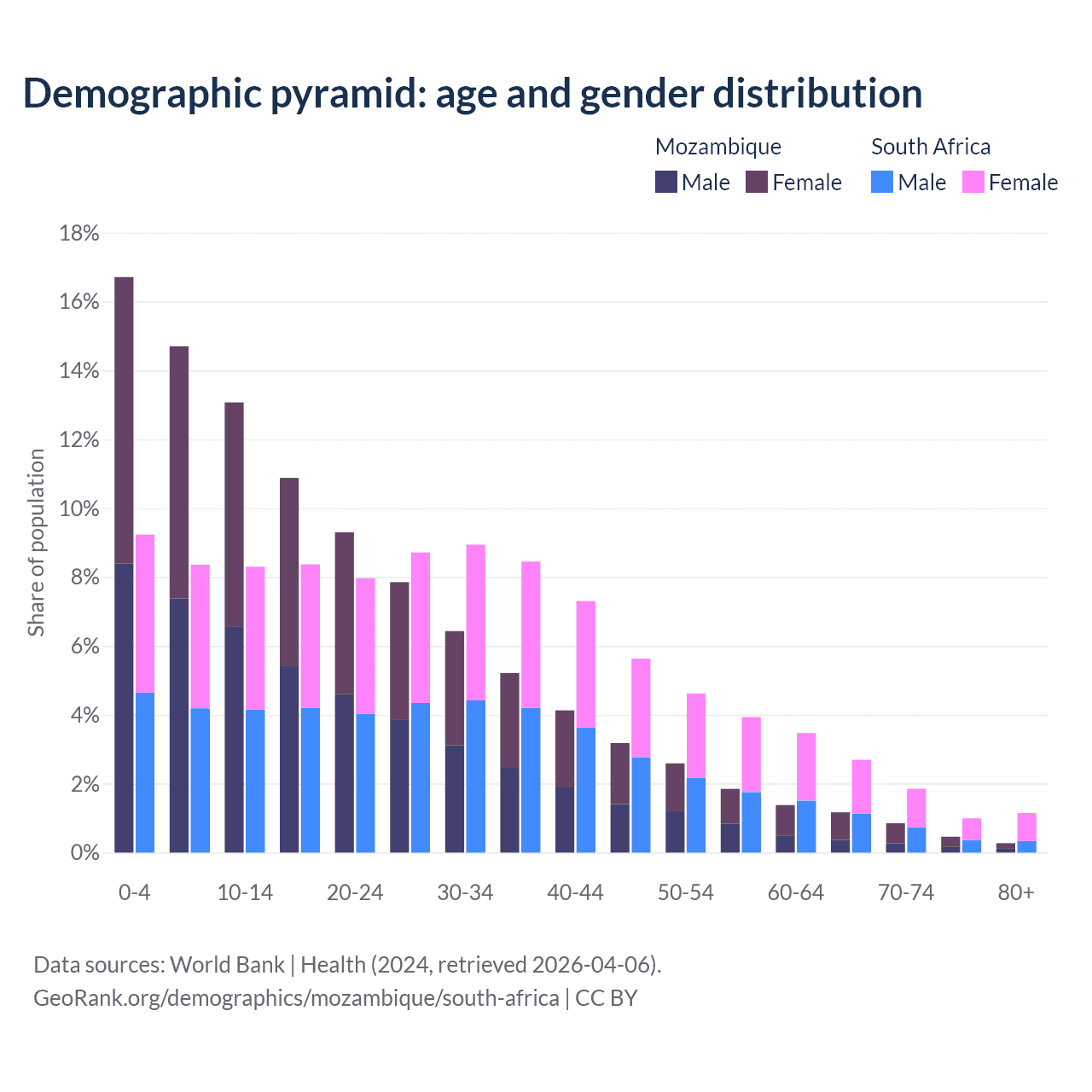 The share of older people aged 65 and over is 2.75% in Mozambique and 6.69% in South Africa. Life expectancy in Mozambique compared to South Africa .