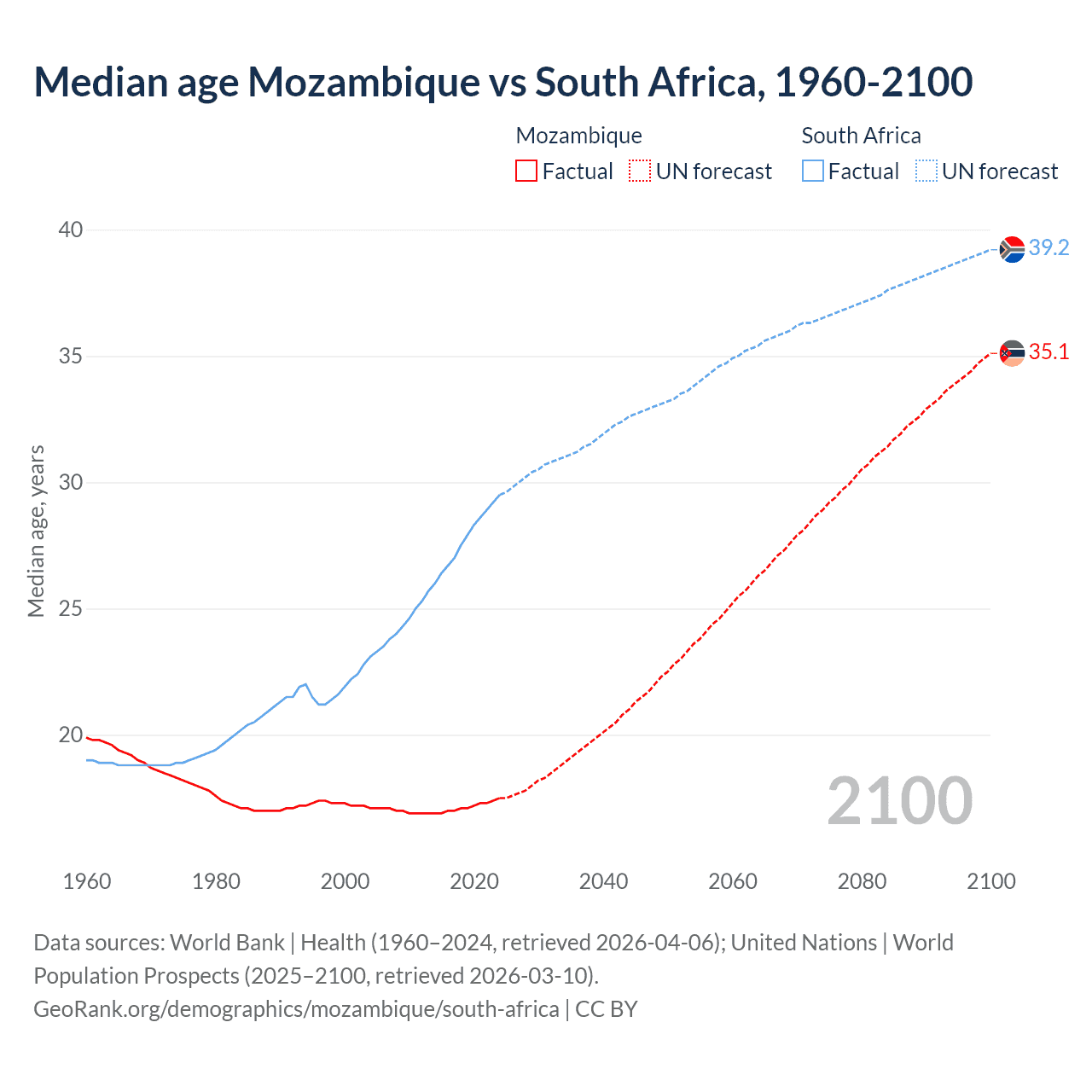 Median age Mozambique vs South Africa, 1960-2100