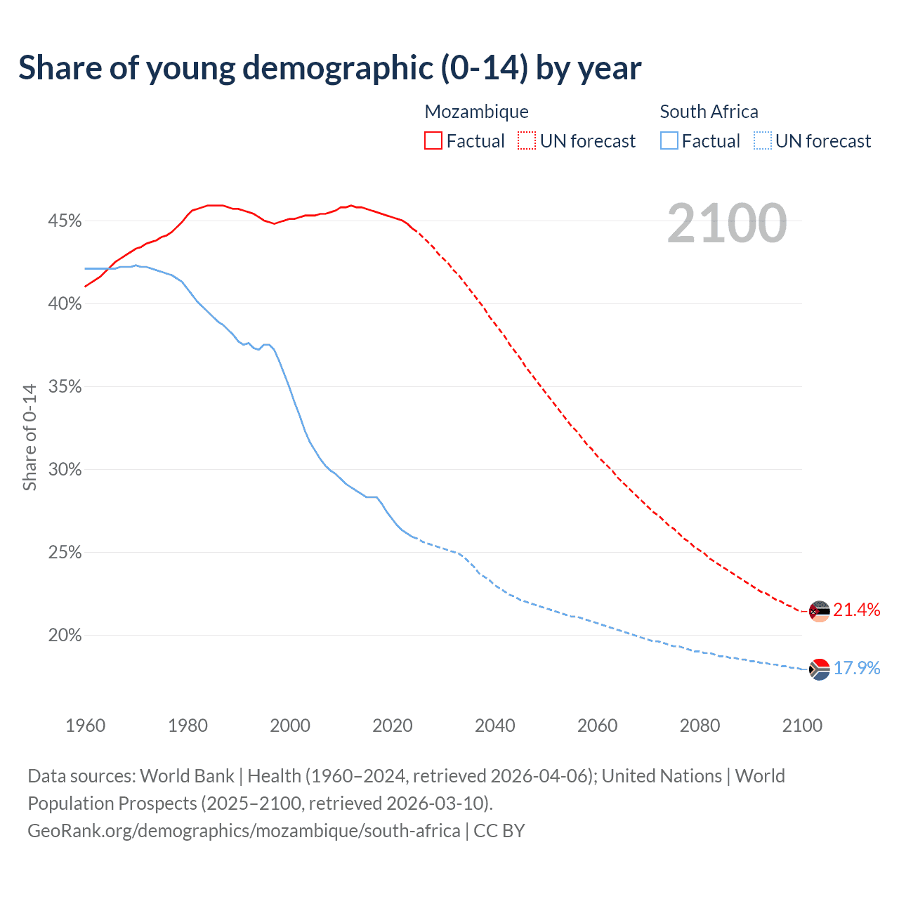 - The share of young demographic (0-15 years old) in Mozambique is 44.5% vs 25.9% in South Africa.