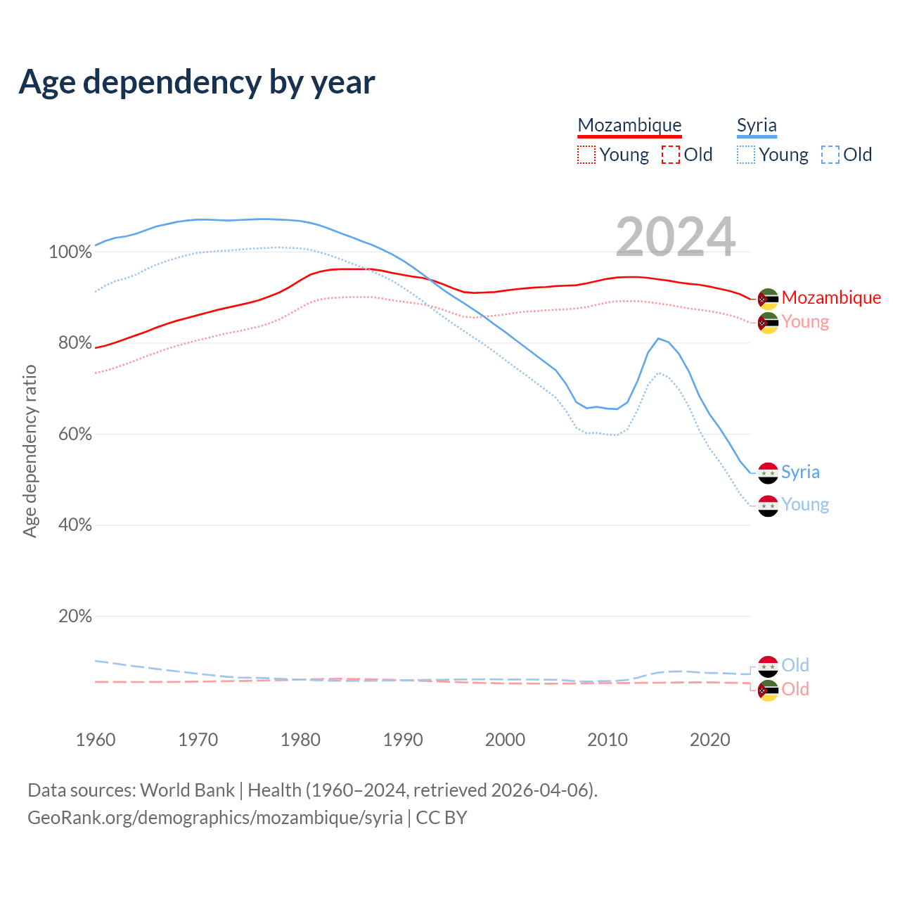 - Mozambique is ranked 189/196 by median age (oldest to youngest) vs 138/196 for Syria.