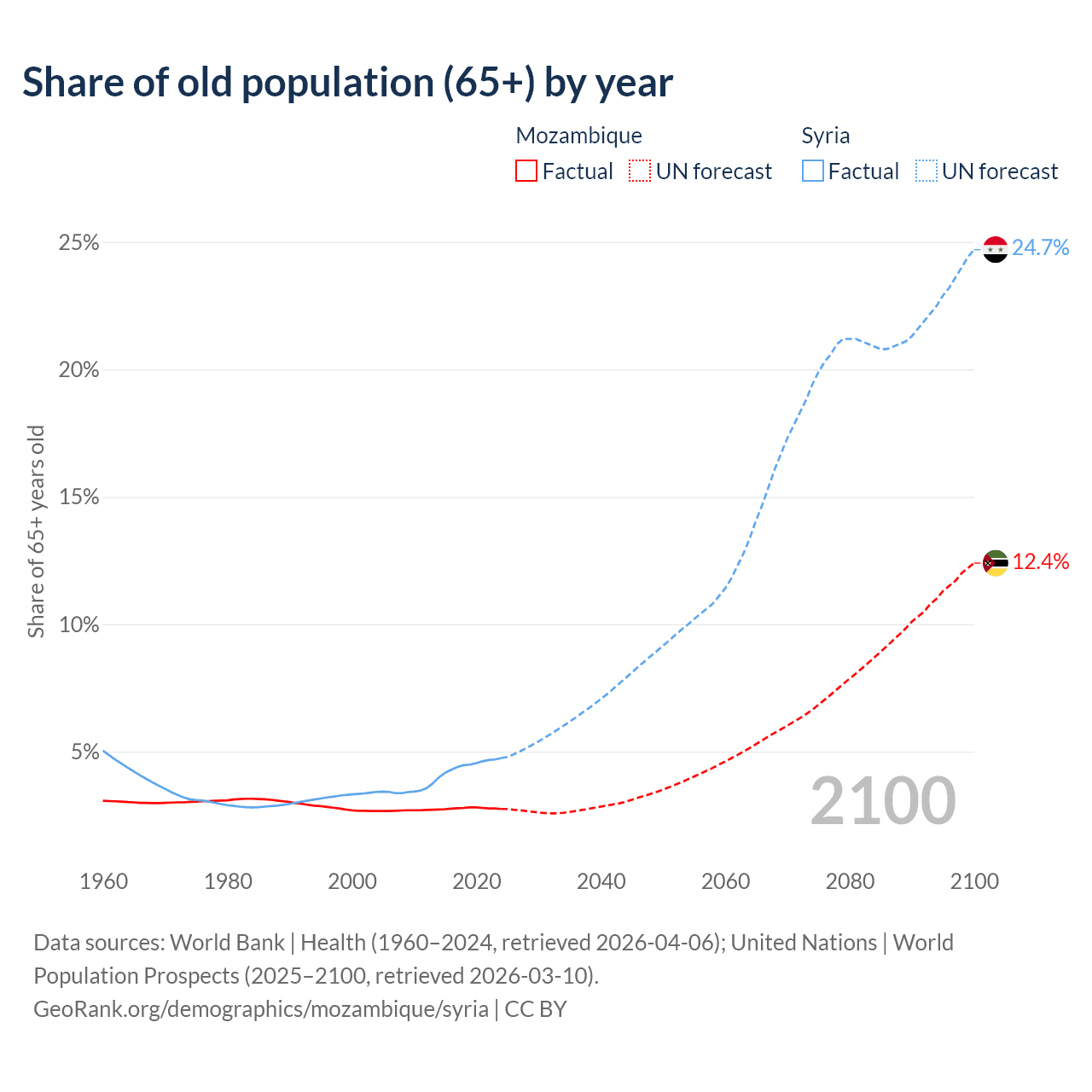 The share of older people aged 65 and over is 2.75% in Mozambique and 4.74% in Syria. Life expectancy in Mozambique compared to Syria .