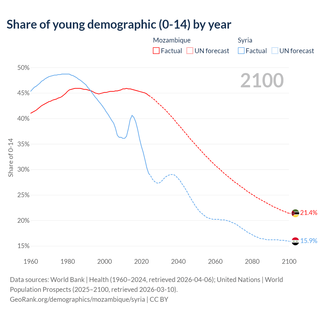 - The share of young demographic (0-15 years old) in Mozambique is 44.5% vs 29.2% in Syria.