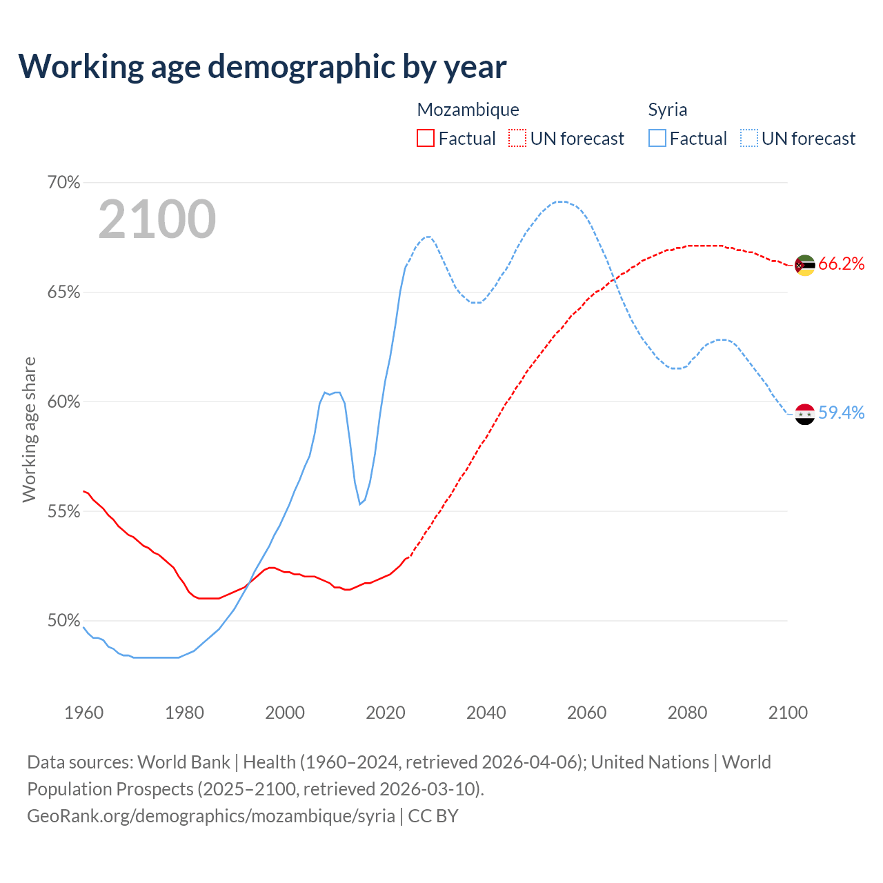 - Mozambique has 19.5M working age adults (aged 15-64) vs 17.7M in Syria.
