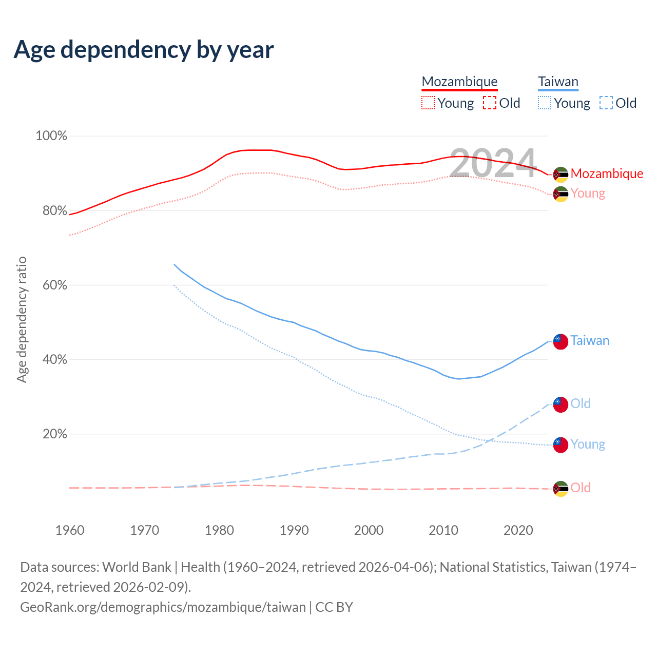 Data sources: World Bank | Health (1960–2024, retrieved 2026-04-06); U.S. Census Bureau (1960–2024, retrieved 2026-02-08); National Statistics, Taiwan (1974–2024, retrieved 2026-02-09).