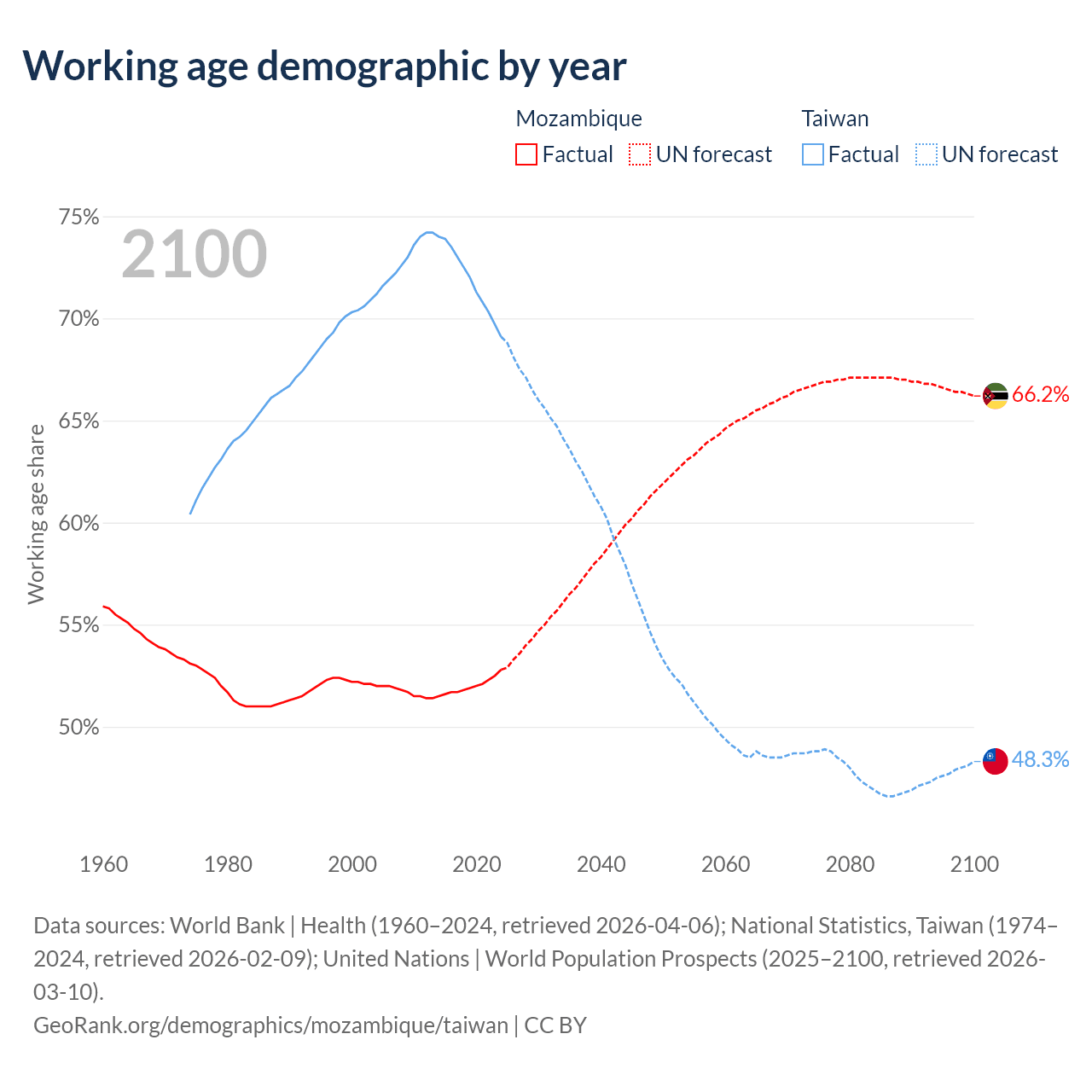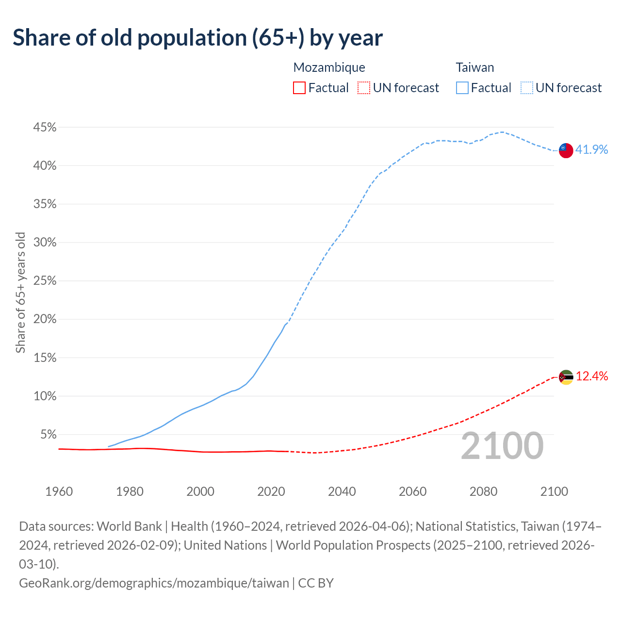 The share of older people aged 65 and over is 2.75% in Mozambique and 19.2% in Taiwan. Life expectancy in Mozambique compared to Taiwan .