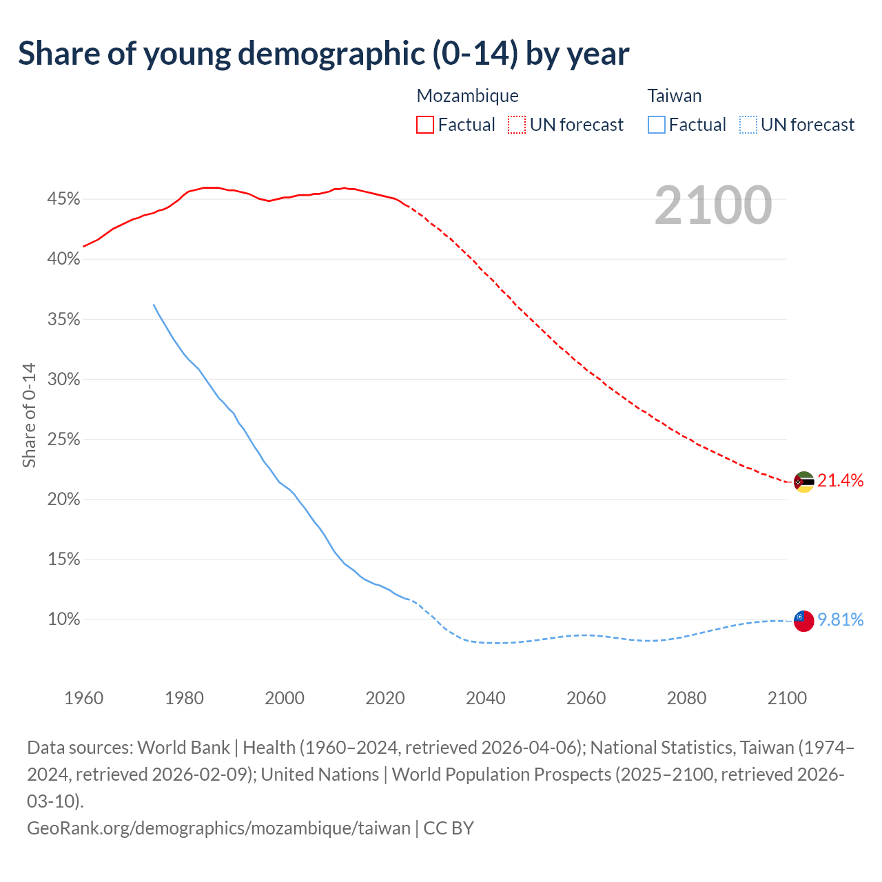 - The share of young demographic (0-15 years old) in Mozambique is 44.5% vs 11.7% in Taiwan.