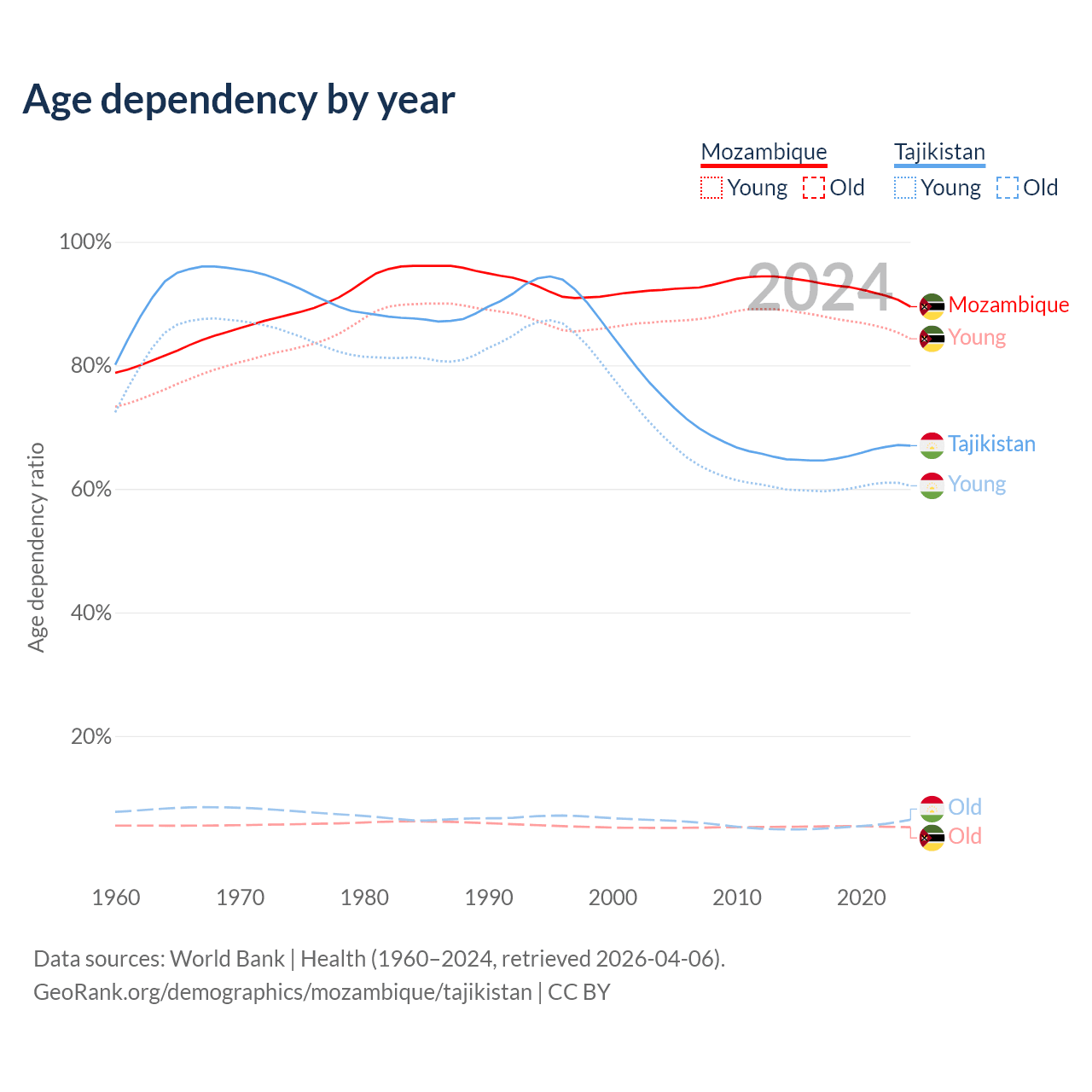 Data sources: World Bank | Health (1960–2024, retrieved 2026-04-06); U.S. Census Bureau (1960–2024, retrieved 2026-02-08).
