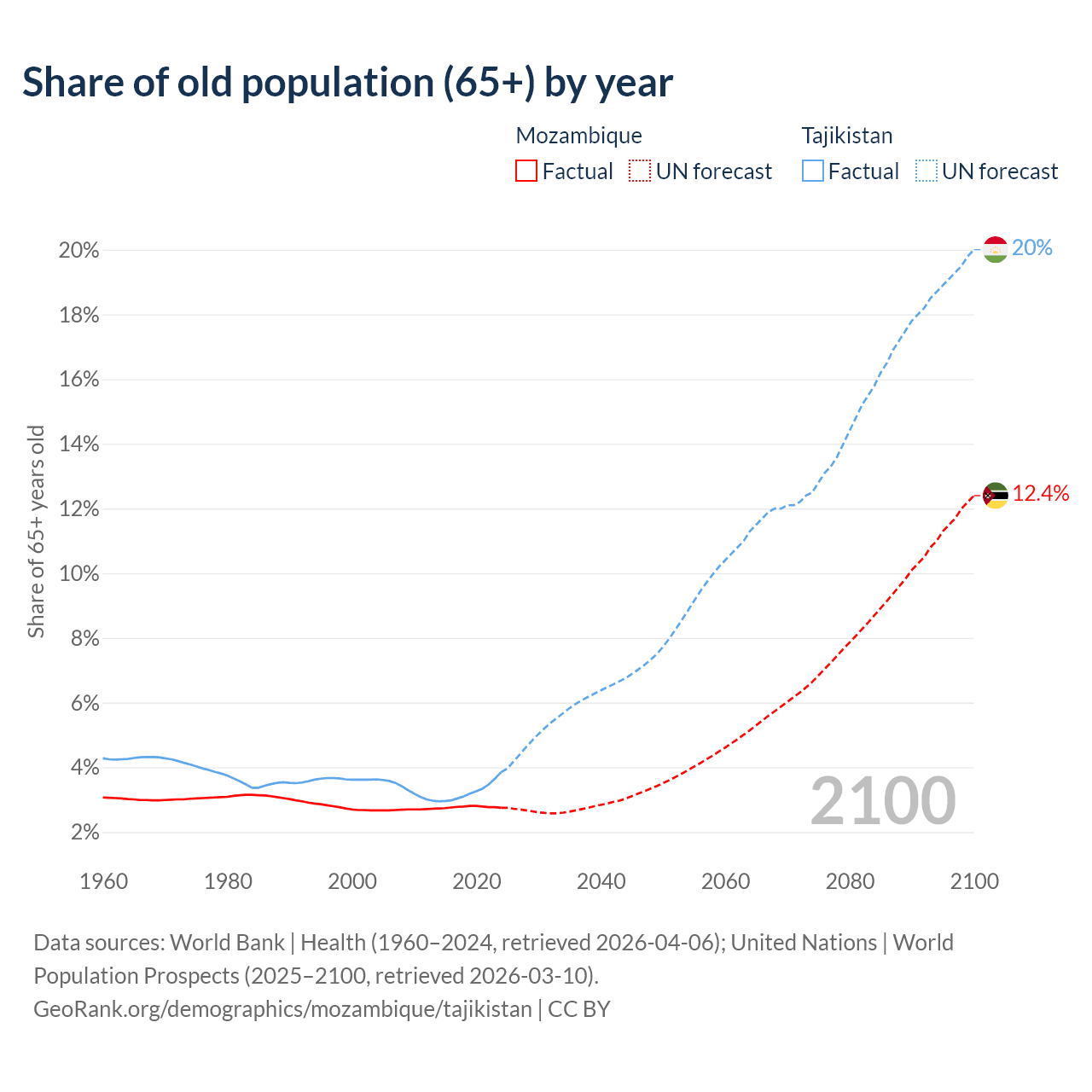The share of older people aged 65 and over is 2.75% in Mozambique and 3.85% in Tajikistan. Life expectancy in Mozambique compared to Tajikistan .
