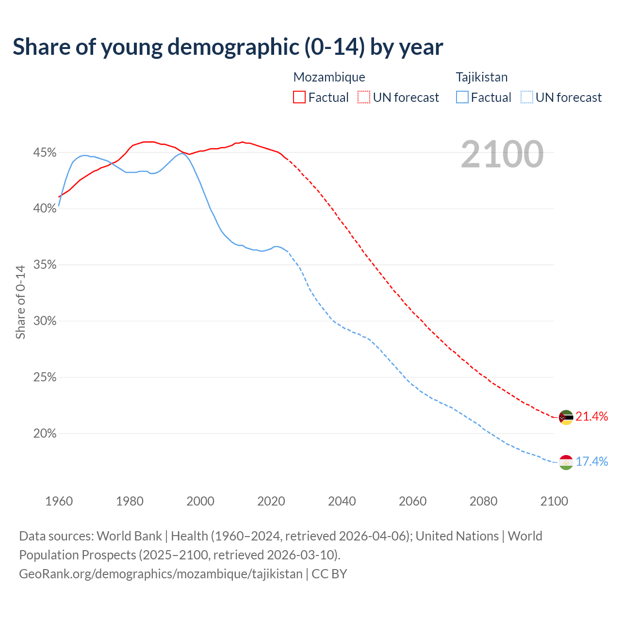 - The share of young demographic (0-15 years old) in Mozambique is 44.5% vs 36.3% in Tajikistan.