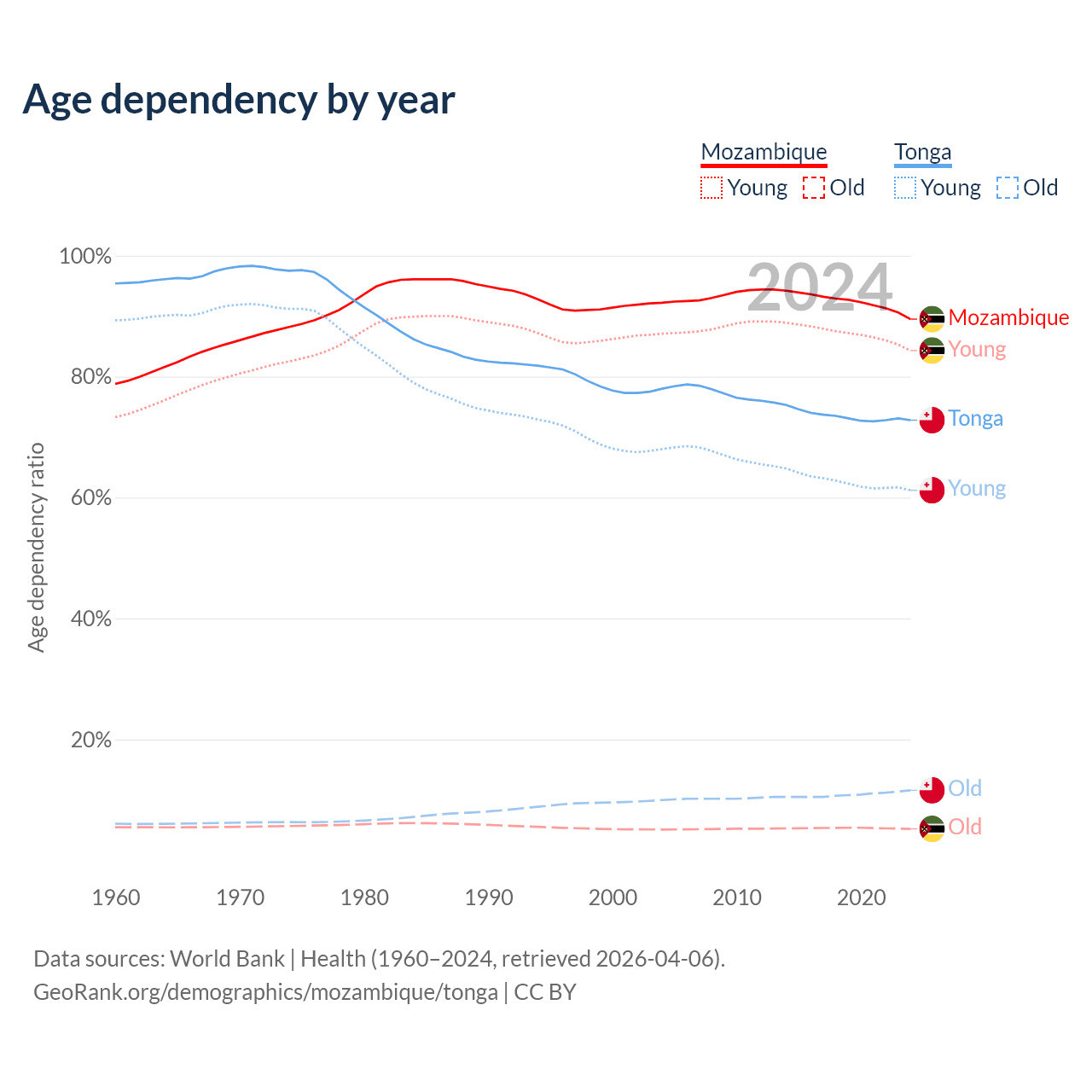 - Mozambique is ranked 189/196 by median age (oldest to youngest) vs 149/196 for Tonga.
