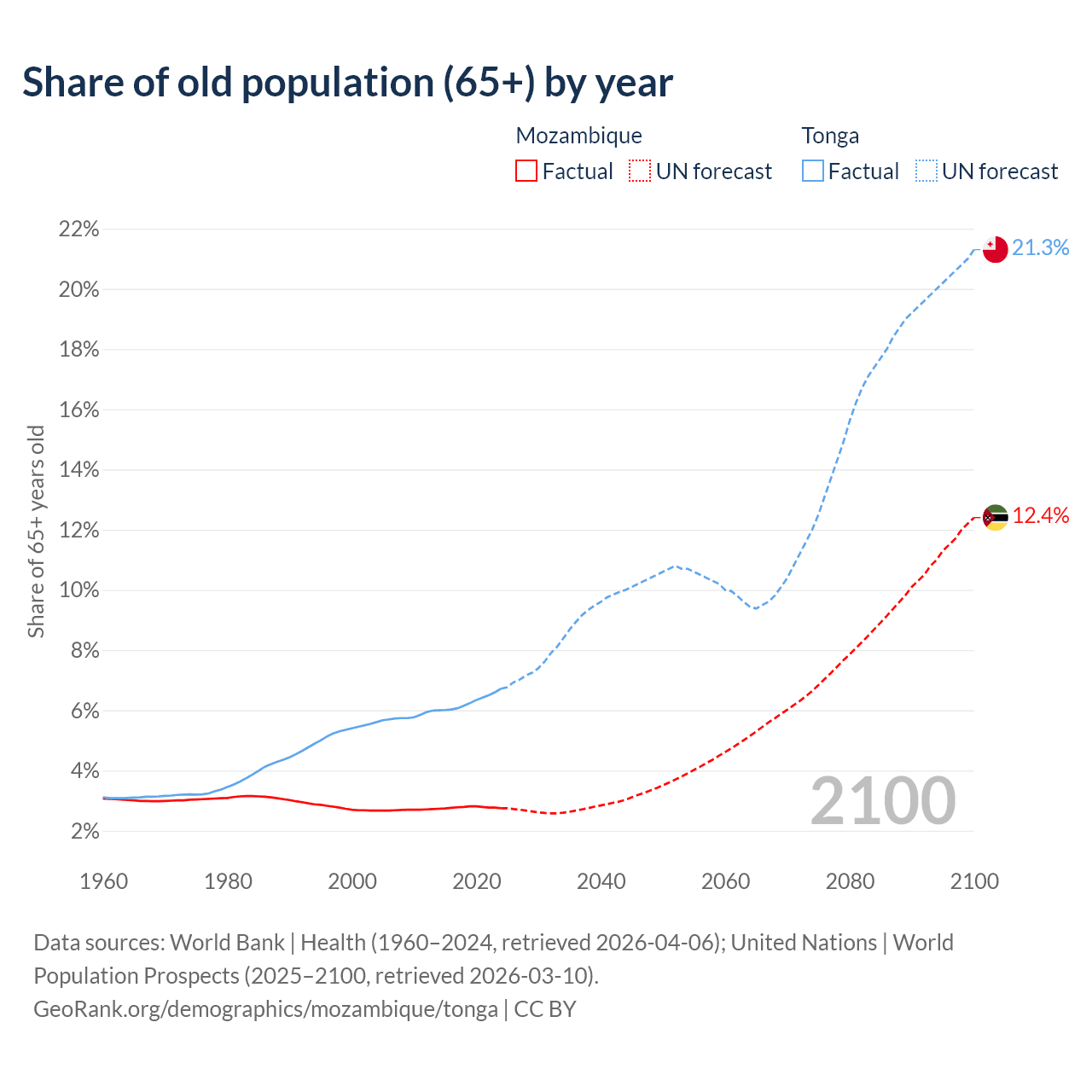 The share of older people aged 65 and over is 2.75% in Mozambique and 6.72% in Tonga. Life expectancy in Mozambique compared to Tonga .