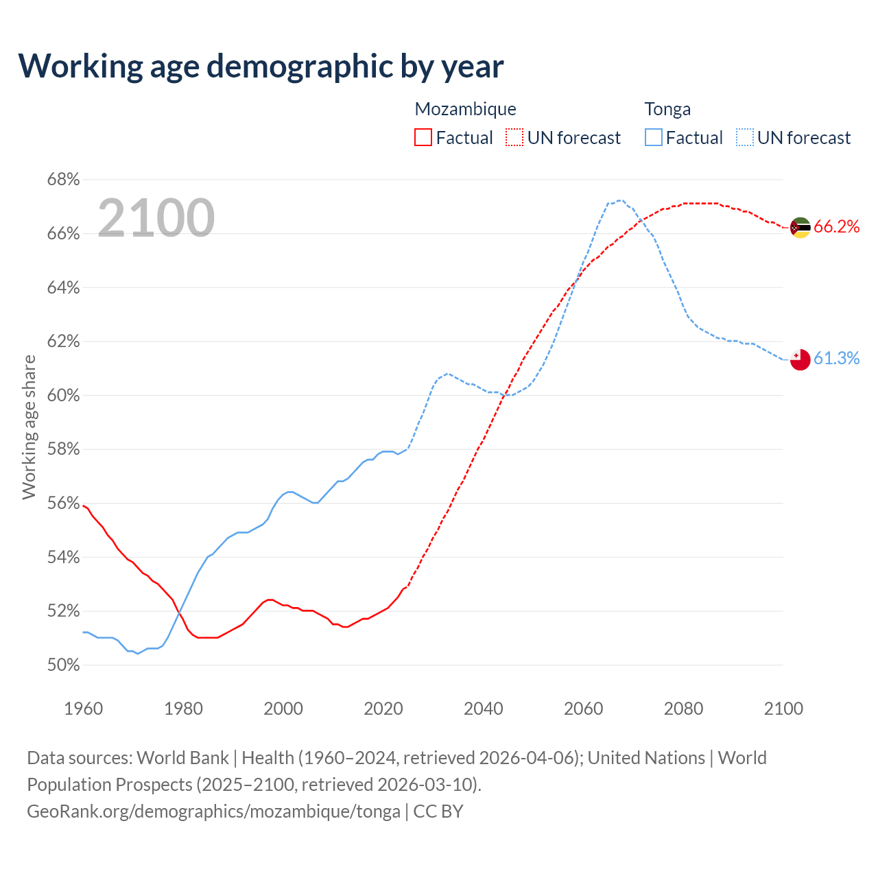- Mozambique has 19.5M working age adults (aged 15-64) vs 59.8K in Tonga.