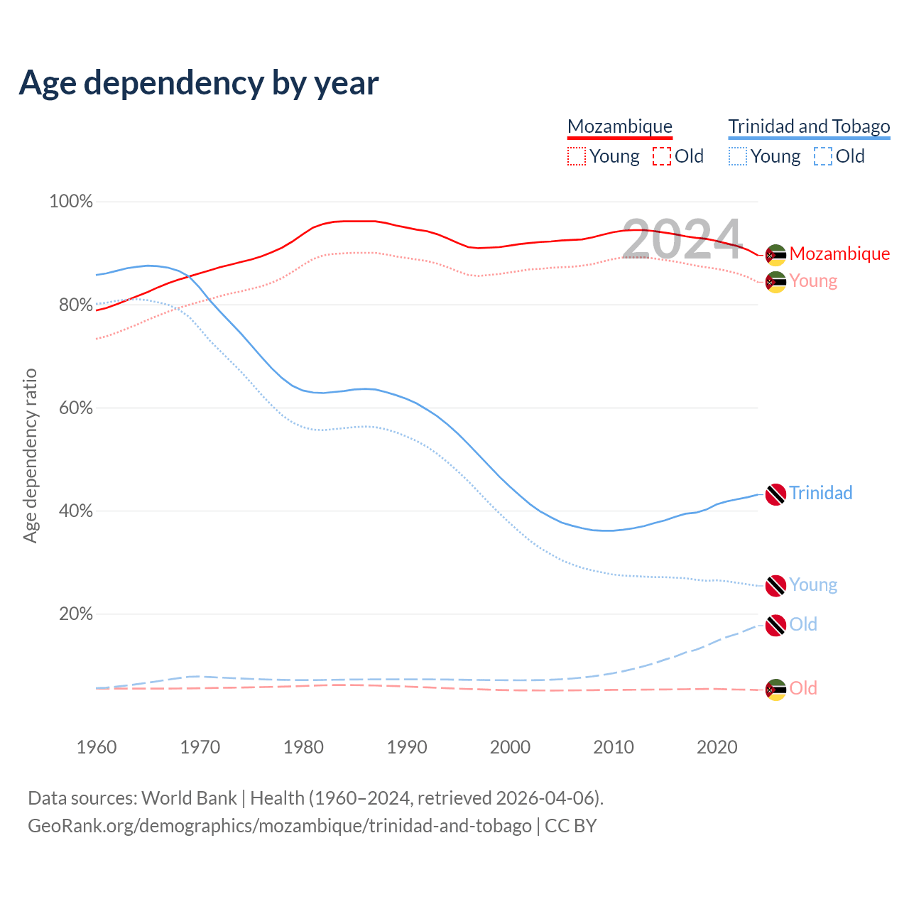 - The share of old-age demographic (65+) in Mozambique is 2.75% vs 12.4% in Trinidad and Tobago.