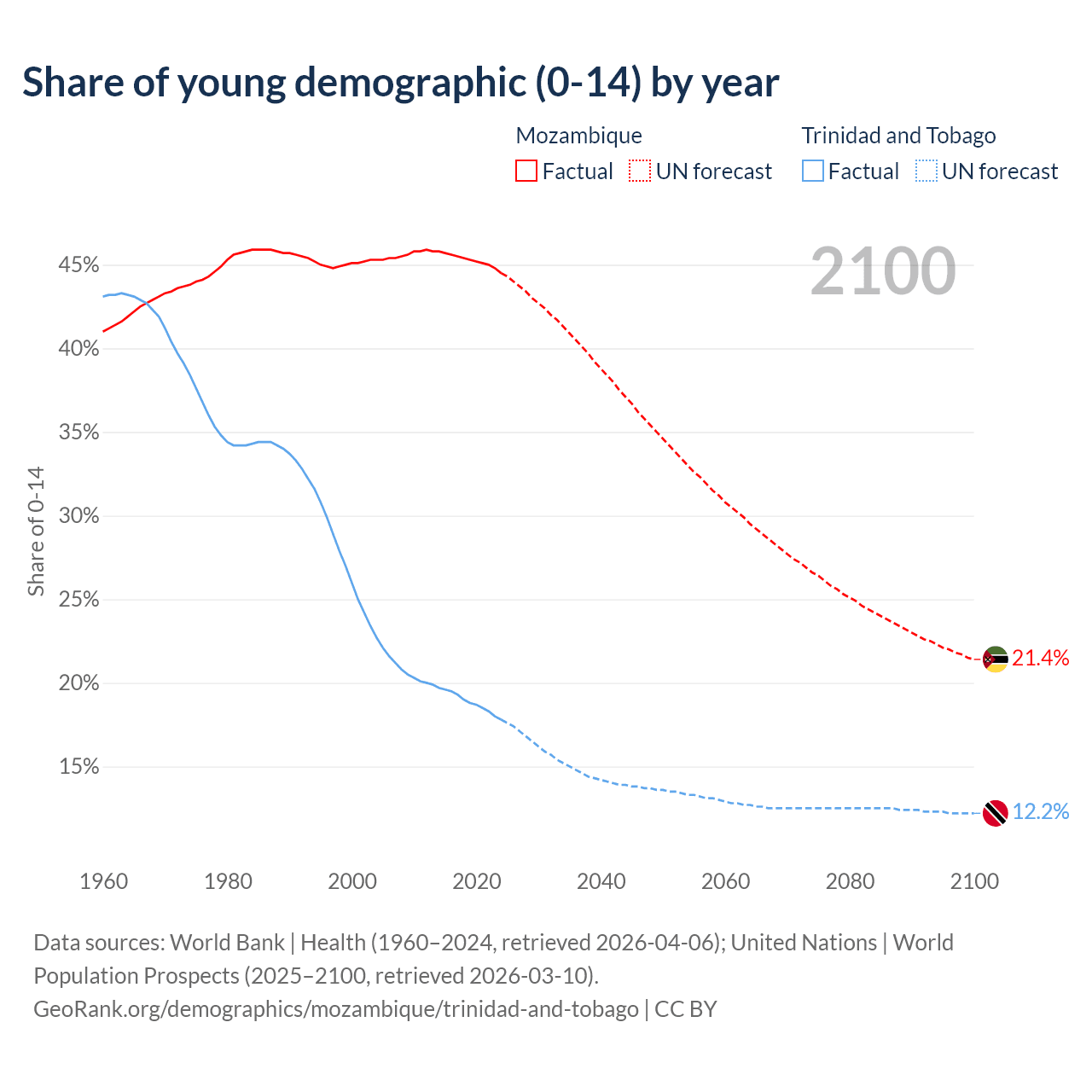 - The share of young demographic (0-15 years old) in Mozambique is 44.5% vs 17.8% in Trinidad and Tobago.