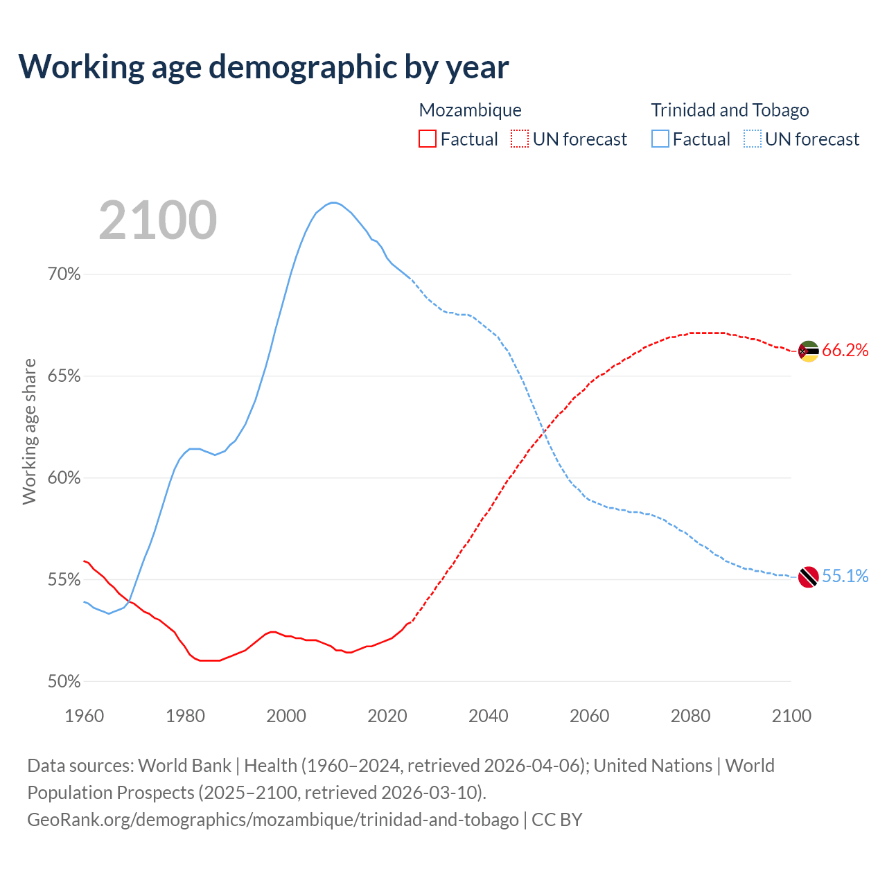 The share of older people aged 65 and over is 2.75% in Mozambique and 12.4% in Trinidad and Tobago. Life expectancy in Mozambique compared to Trinidad and Tobago .