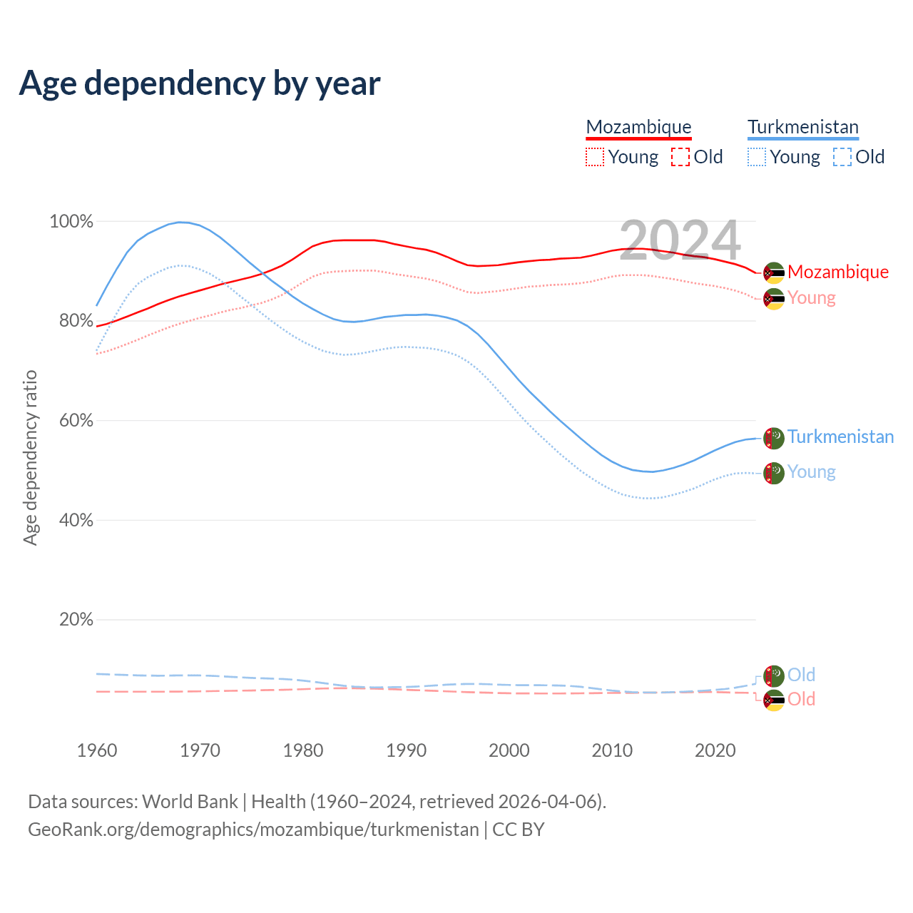 - Mozambique is ranked 189/196 by median age (oldest to youngest) vs 119/196 for Turkmenistan.