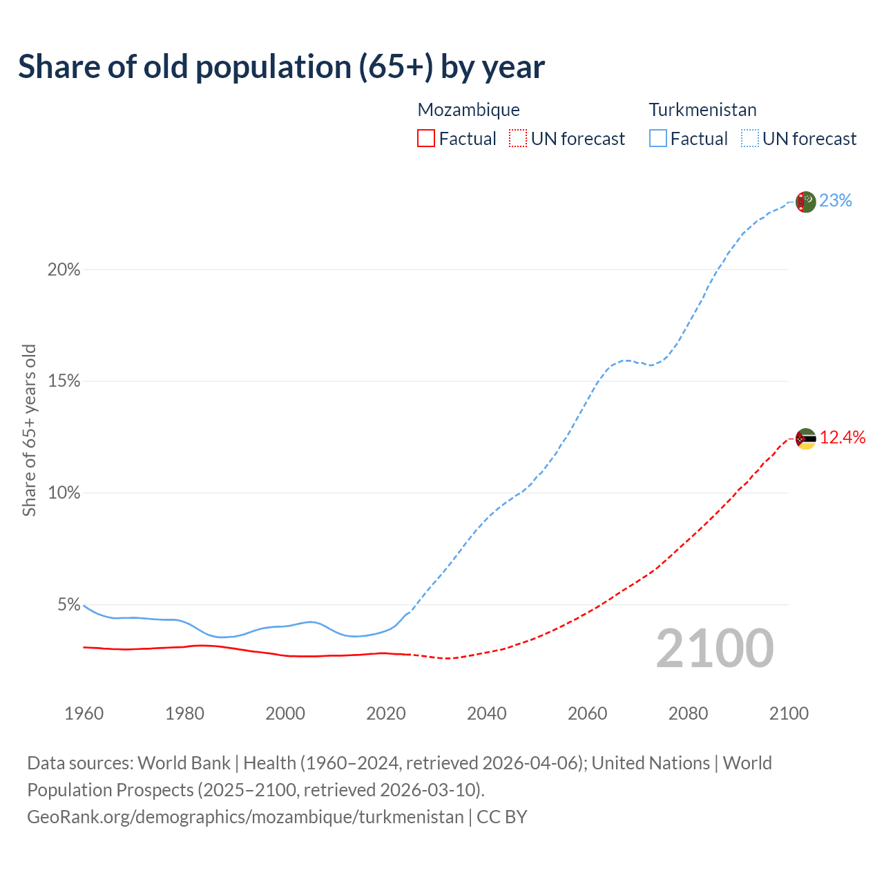 The share of older people aged 65 and over is 2.75% in Mozambique and 4.53% in Turkmenistan. Life expectancy in Mozambique compared to Turkmenistan .