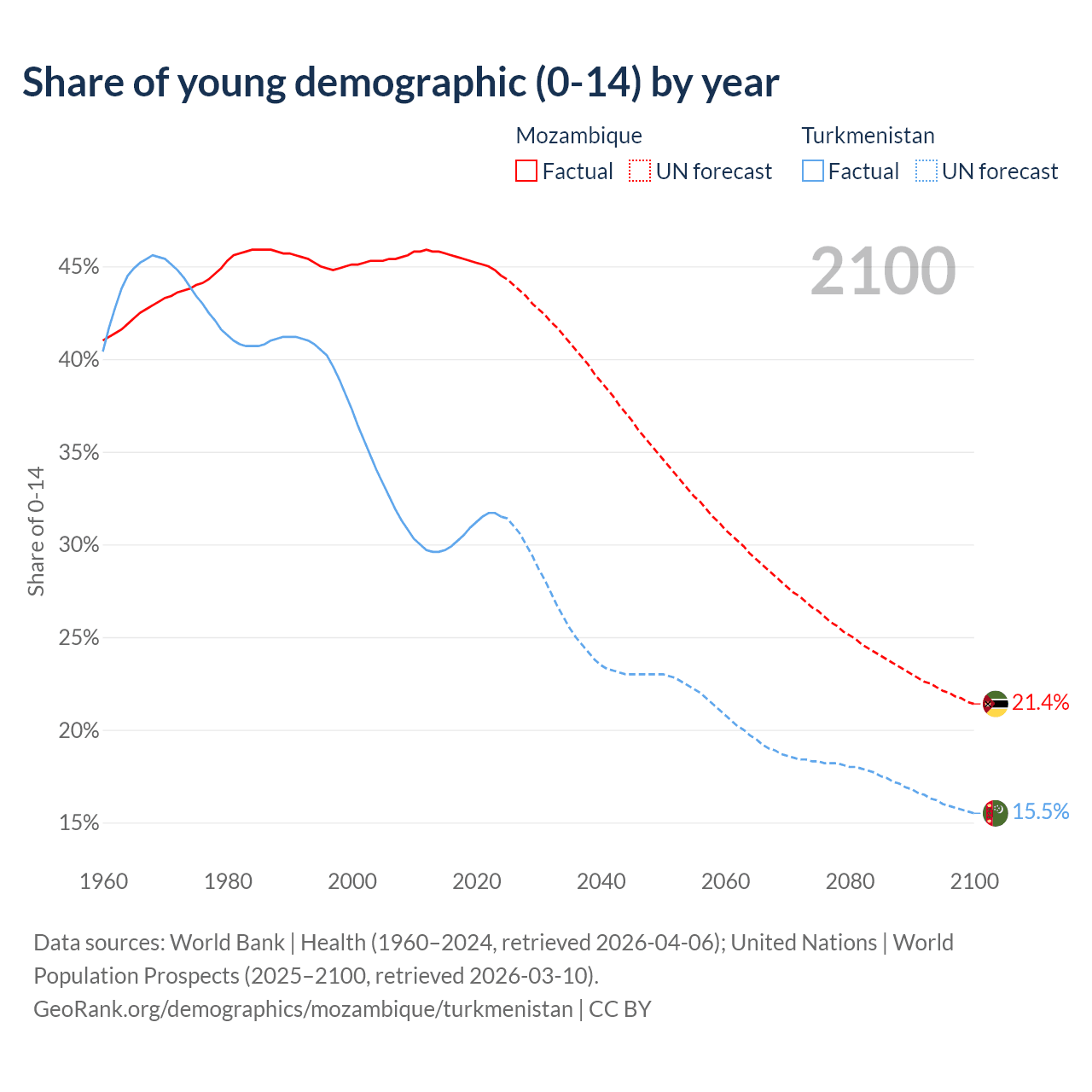 - The share of young demographic (0-15 years old) in Mozambique is 44.5% vs 31.5% in Turkmenistan.