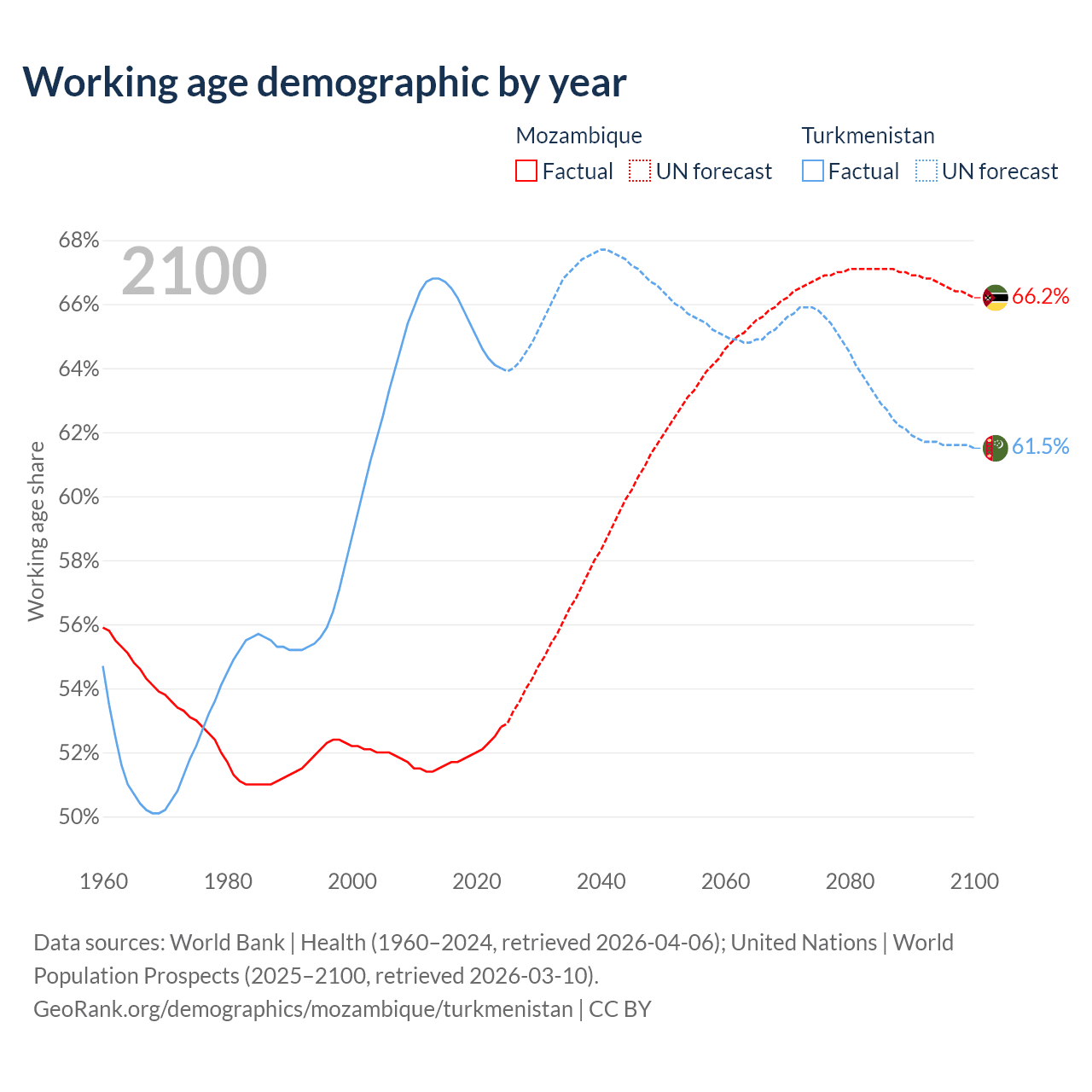 - Mozambique has 19.5M working age adults (aged 15-64) vs 4.97M in Turkmenistan.